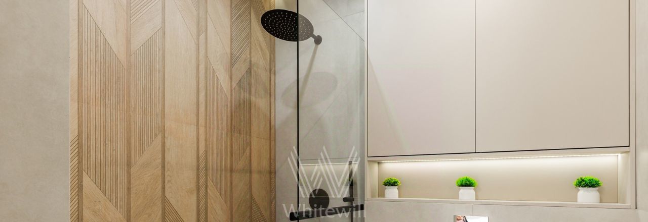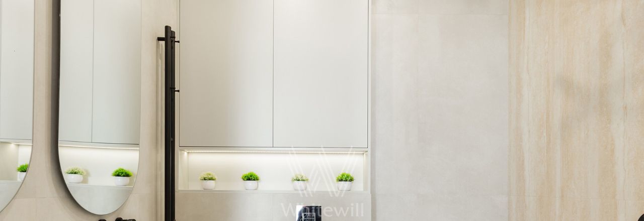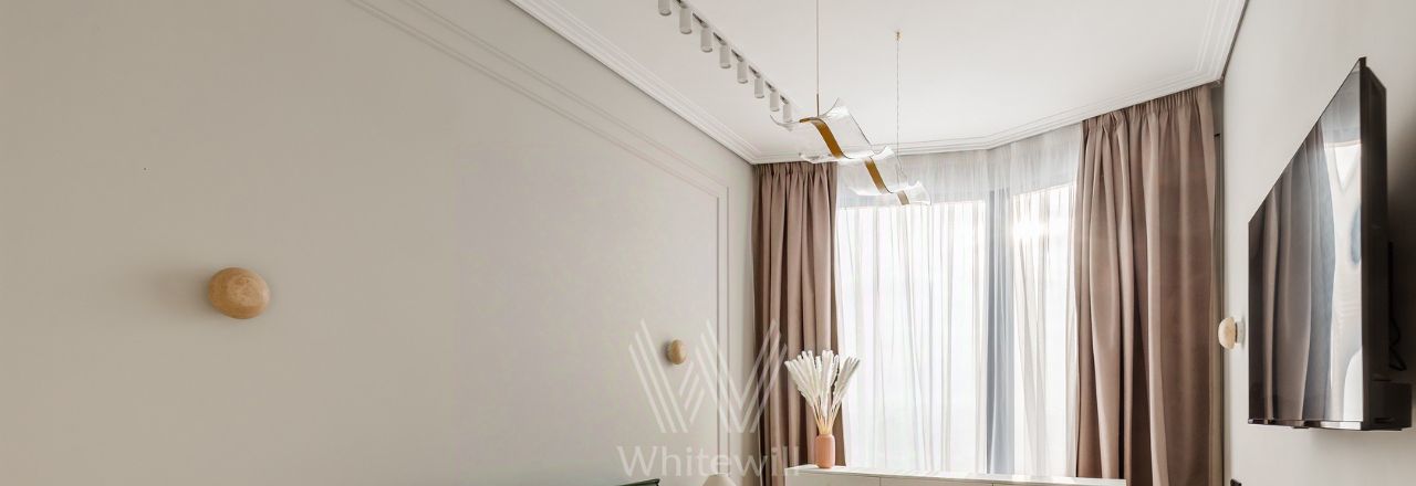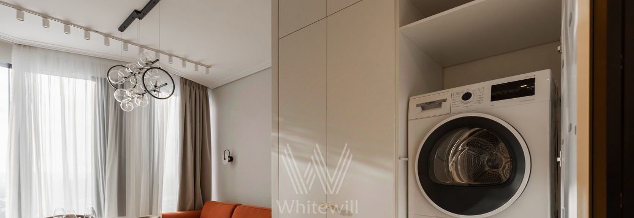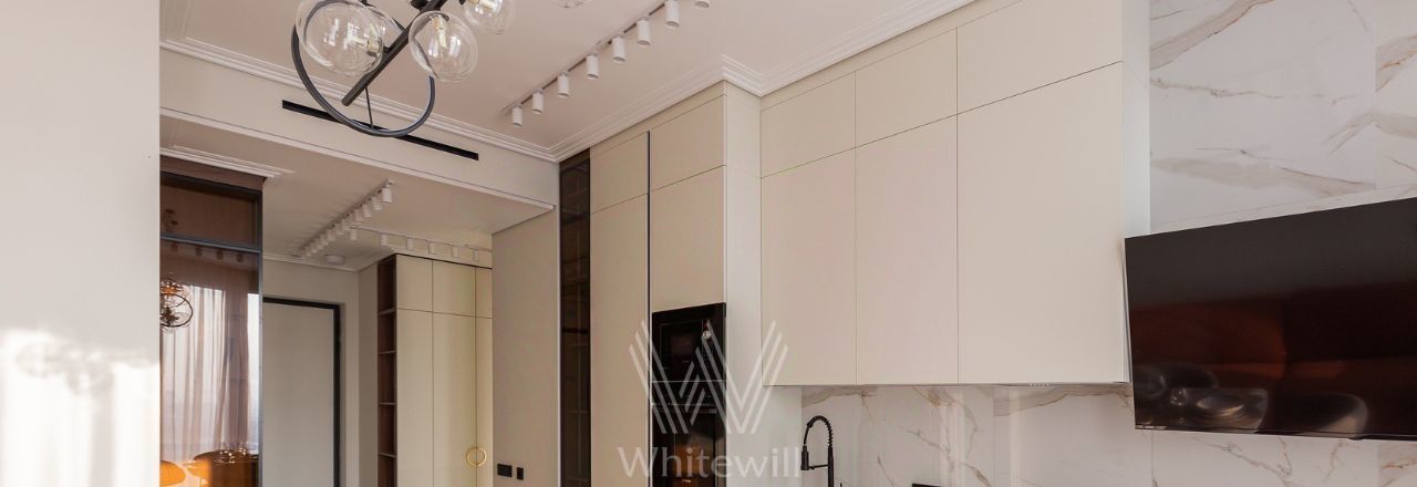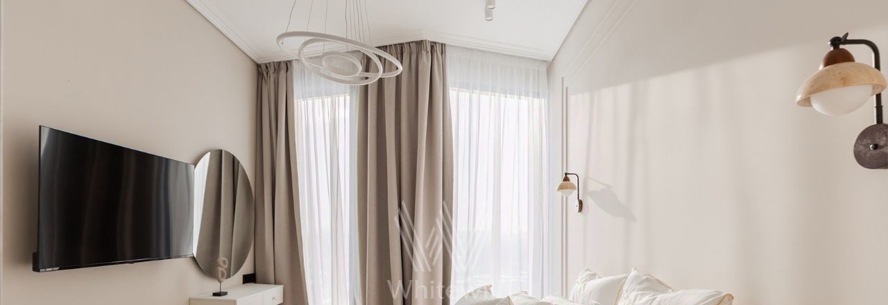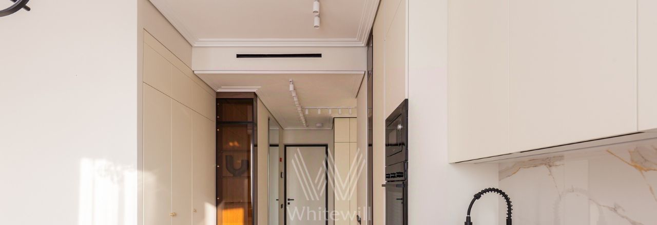 Спланирована кухня-гостиная с обеденной зоной, мастер-спальня с собственной ванной комнатой и гардеробной, вторая спальня или кабинет, санузел с душевой, прихожая. Квартира полностью меблирована и оборудована бытовой техникой Bosch, установлены кондиционеры. Предусмотрено машино-место в подземном паркинге.