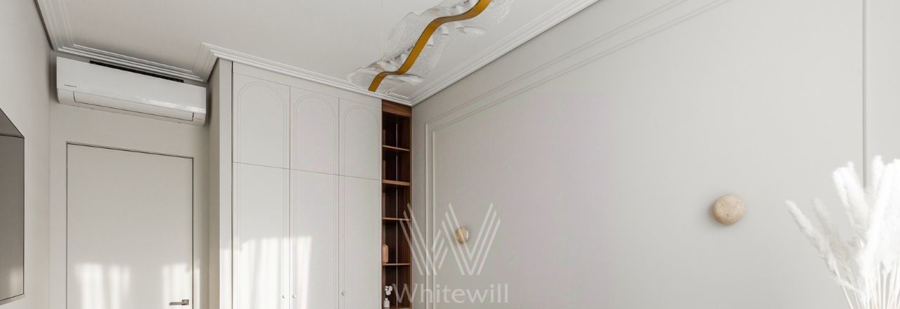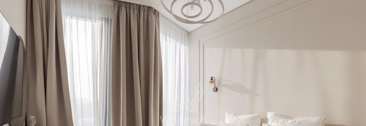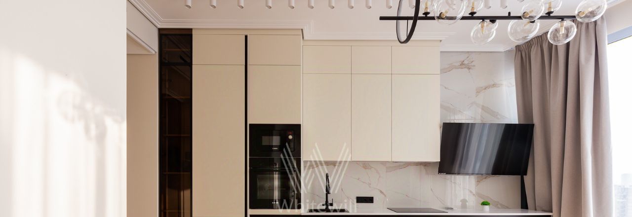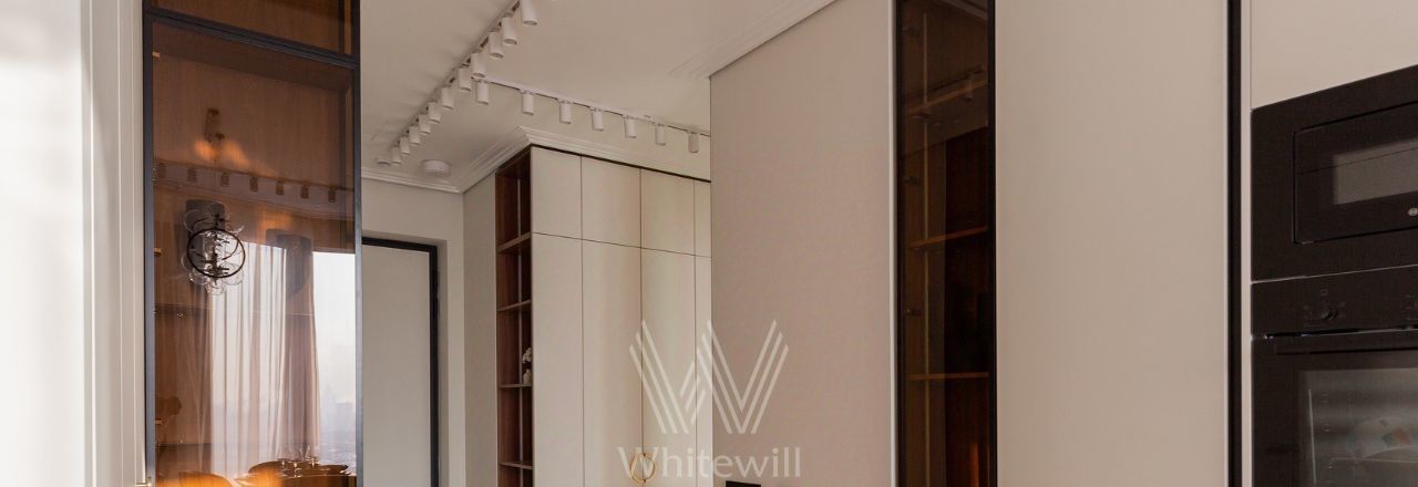 Квартира с 2 спальнями общей площадью 65 м² в комплексе бизнес-класса "Береговой-2" на 23 этаже. Выполнена дизайнерская отделка в современном стиле. Интерьер оформлен в лаконичных светлых тонах с яркими акцентами. Панорамные окна наполняют пространство светом и воздухом. Из окон открывается вид на город.
