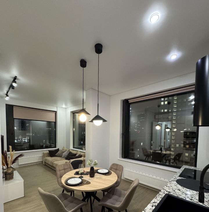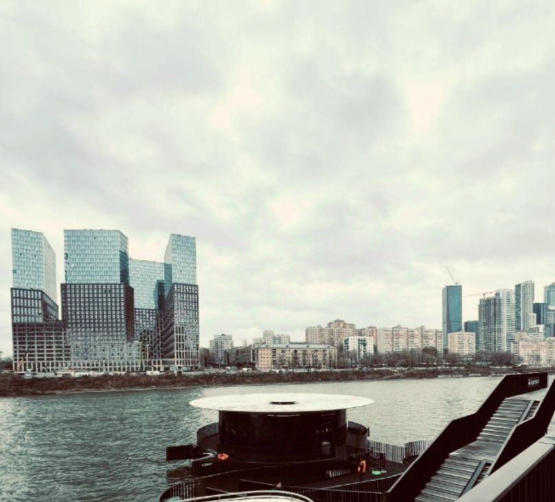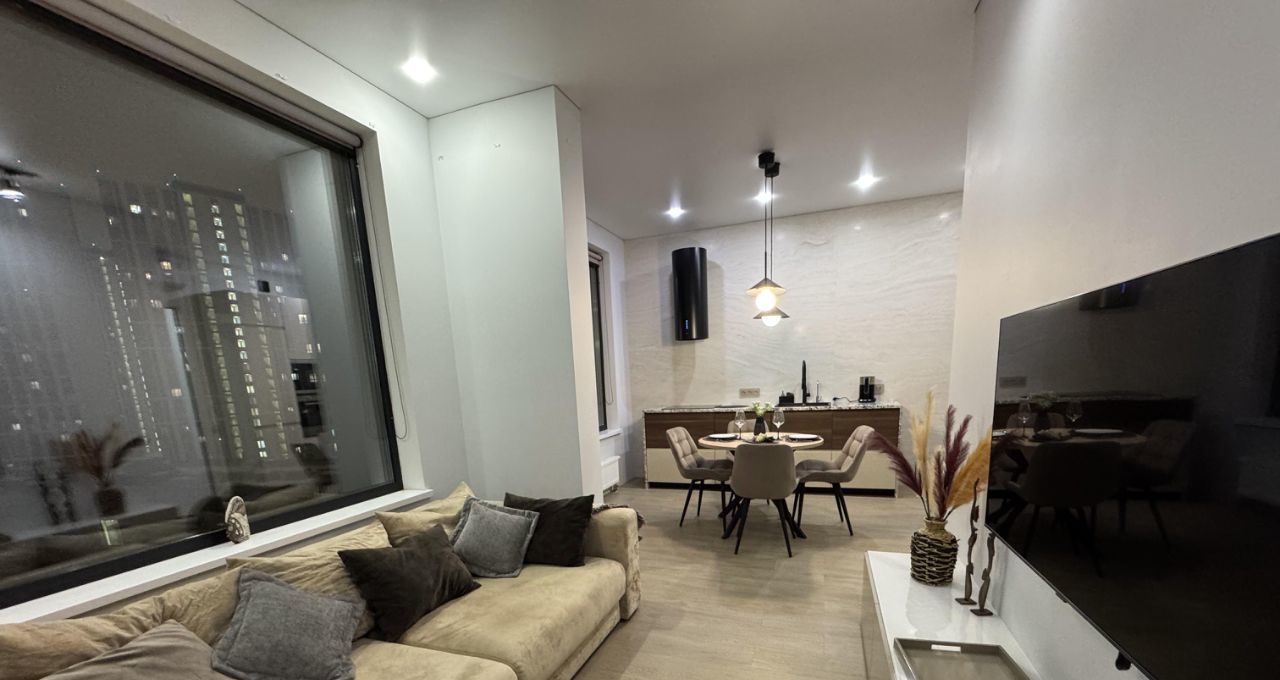 Гостиная: Просторная кухня-гостиная (23 кв. м) с тремя панорамными окнами. Прямой вид на Москву-реку и комплекс Москва-Сити.