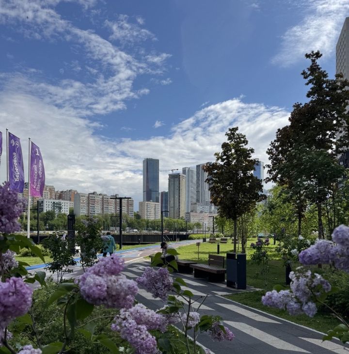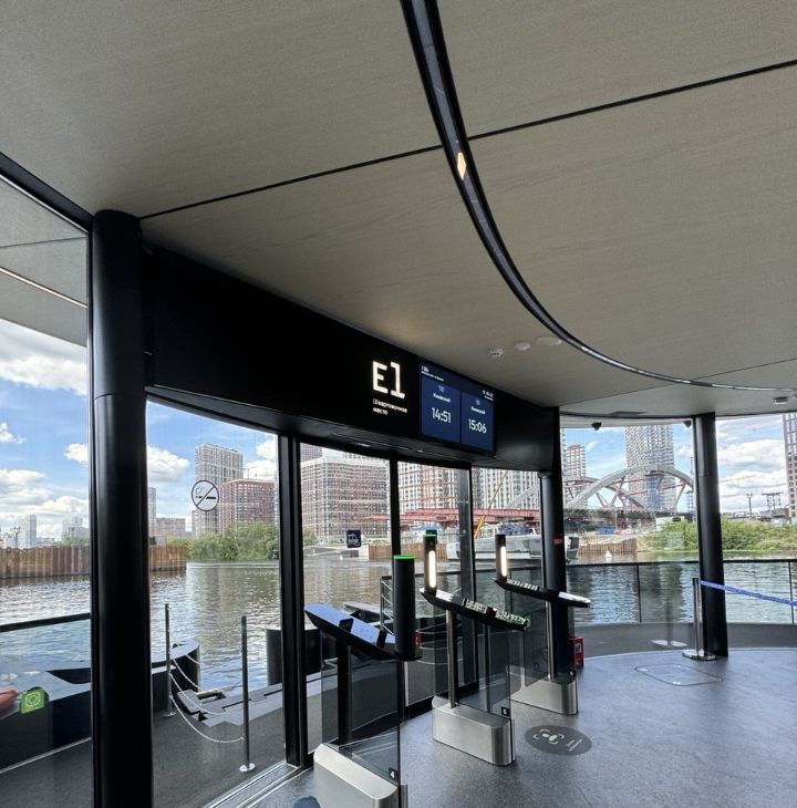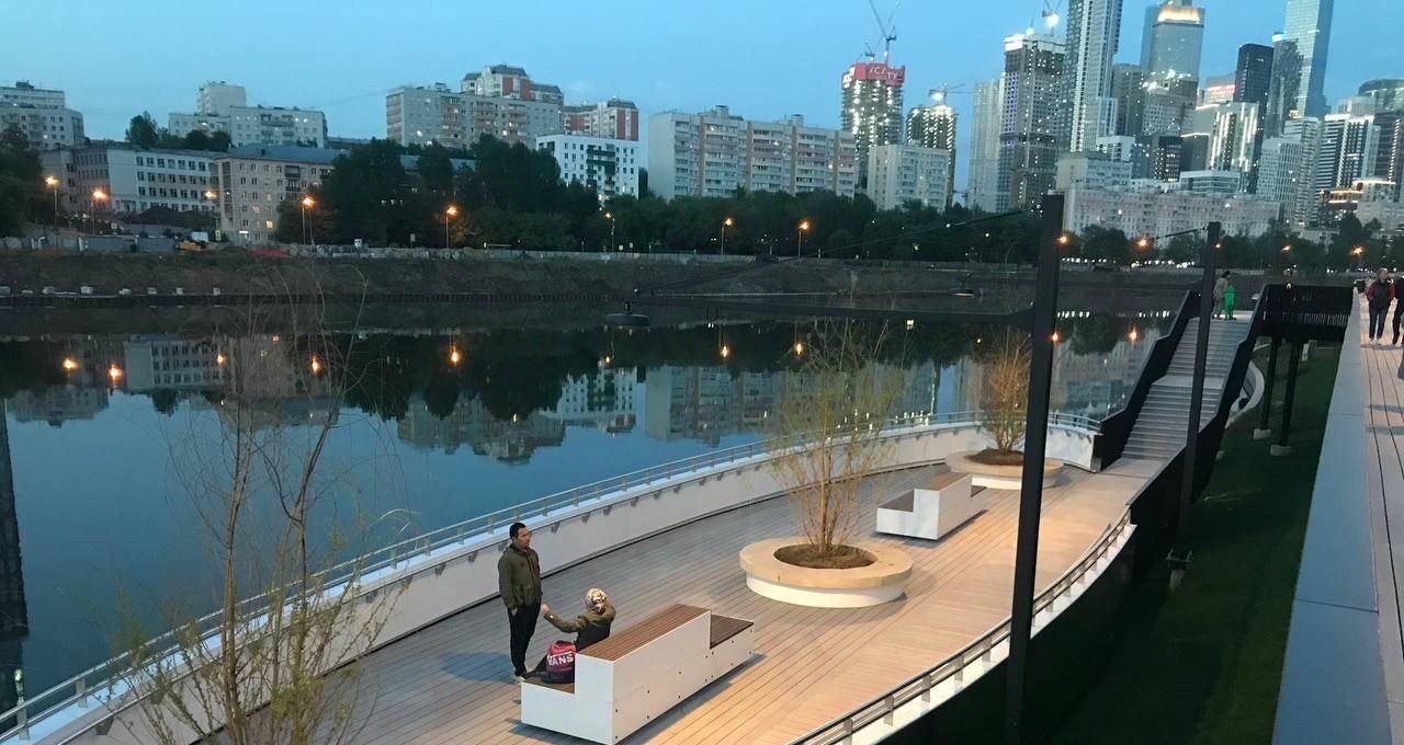 Прогулочная набережная с велодорожками, шезлонгами и мостиками. Причал для электоросудов. В близи находится парк Фили.