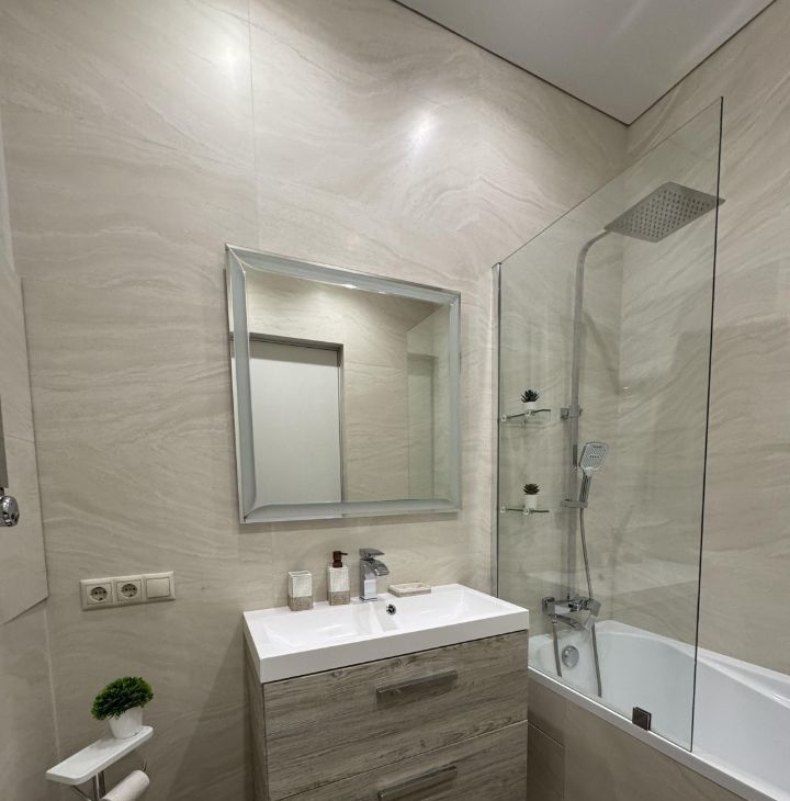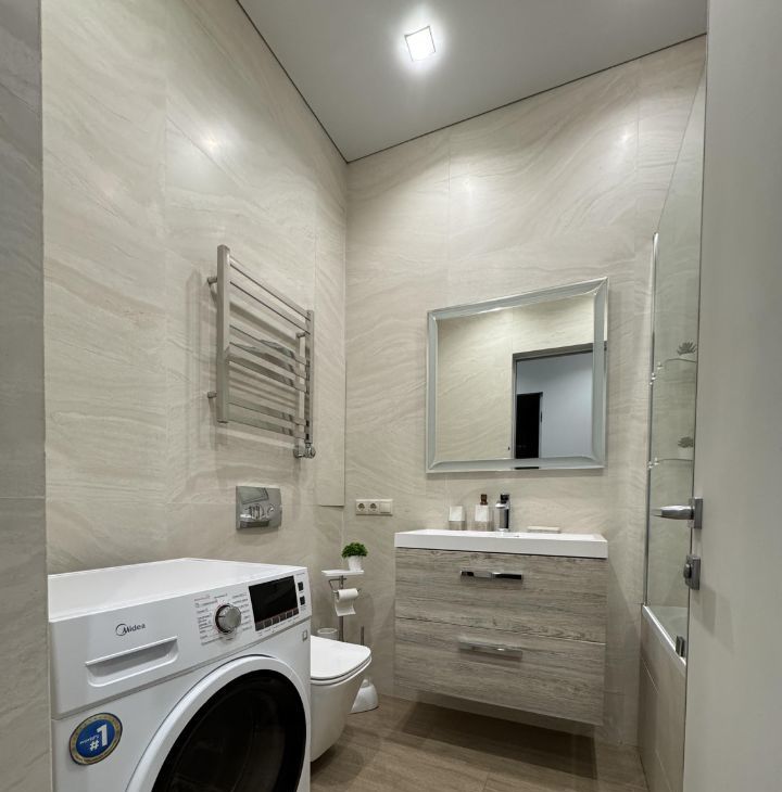 Санузел: Ванная комната, отделанная травертином.