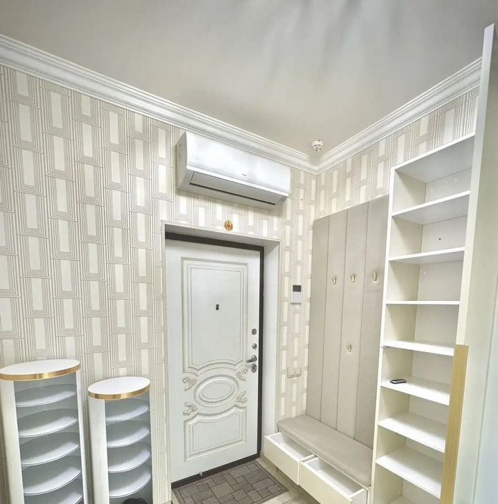 6. Просторная входная зона оборудована встроенным шкафом, вертикальными вращающимися обувницами и двумя банкетками с ящиками для хранения.