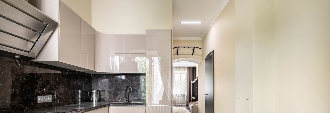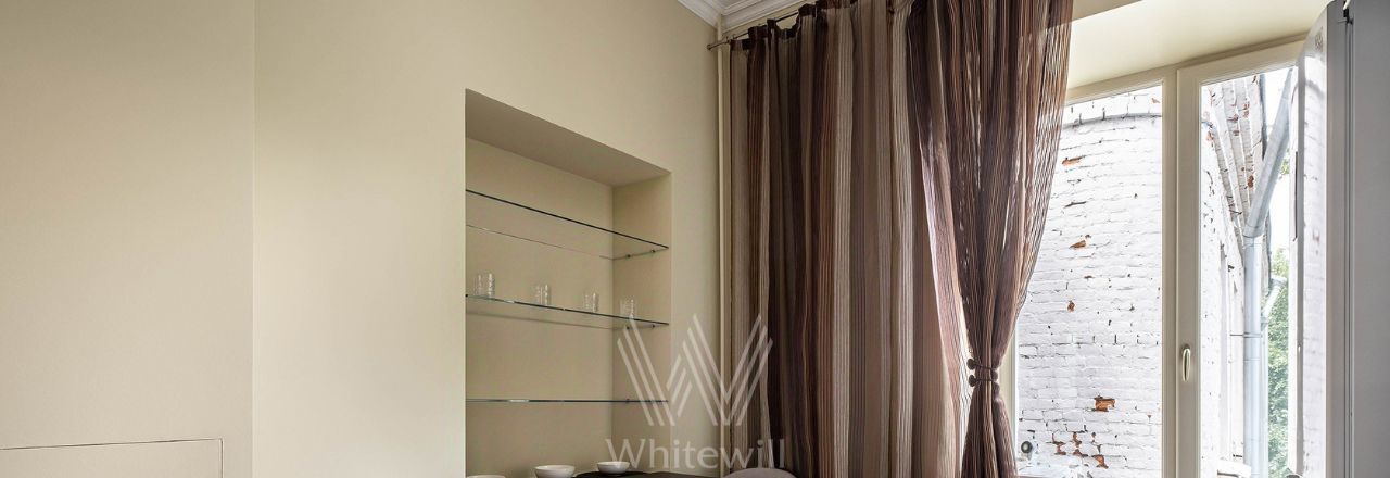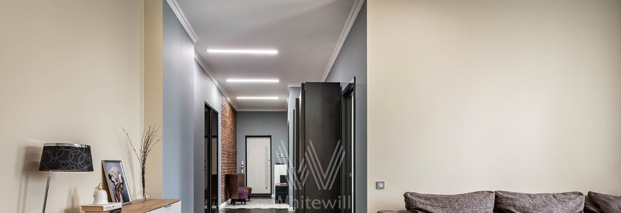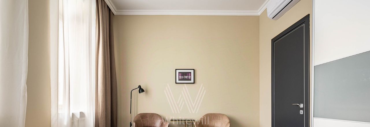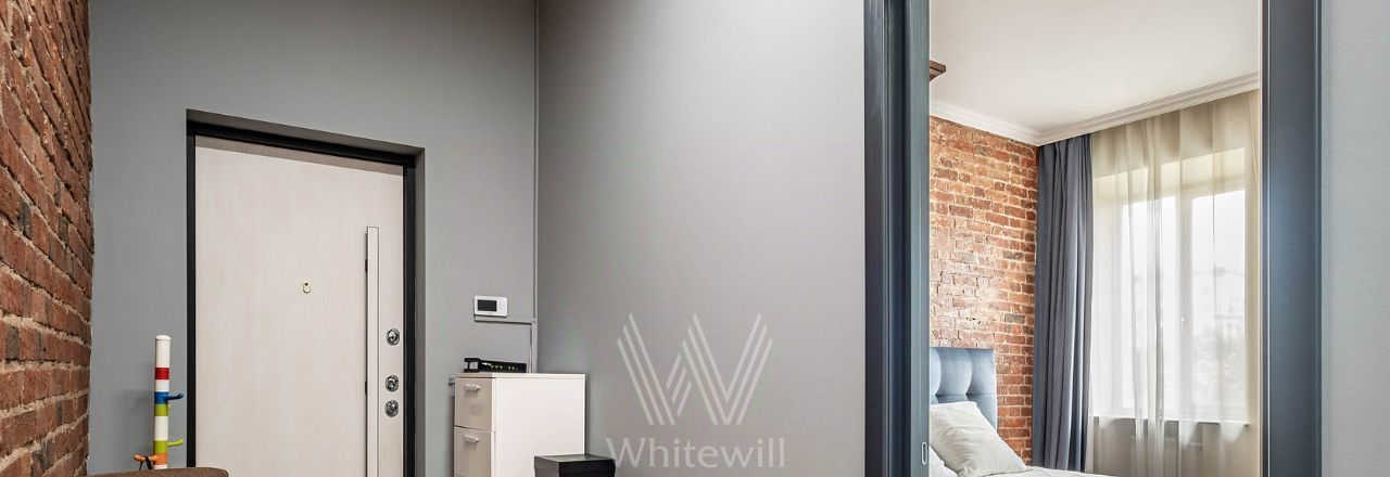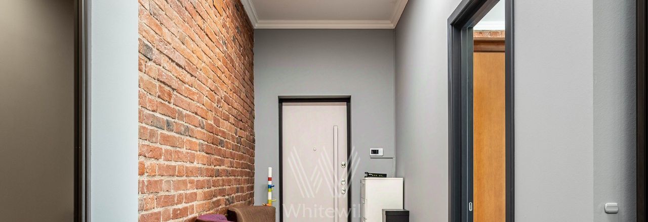 Квартира с 2-мя спальнями в историческом особняке у Тверского бульвара. Квартира общей площадью 95 м² расположена на последнем этаже. Выполнена дизайнерская отделка в современном стиле, часть стен оформлена открытой кирпичной кладкой. Большое количество окон и потолки высотой 3,2 метра наполняют пространство естественным светом.