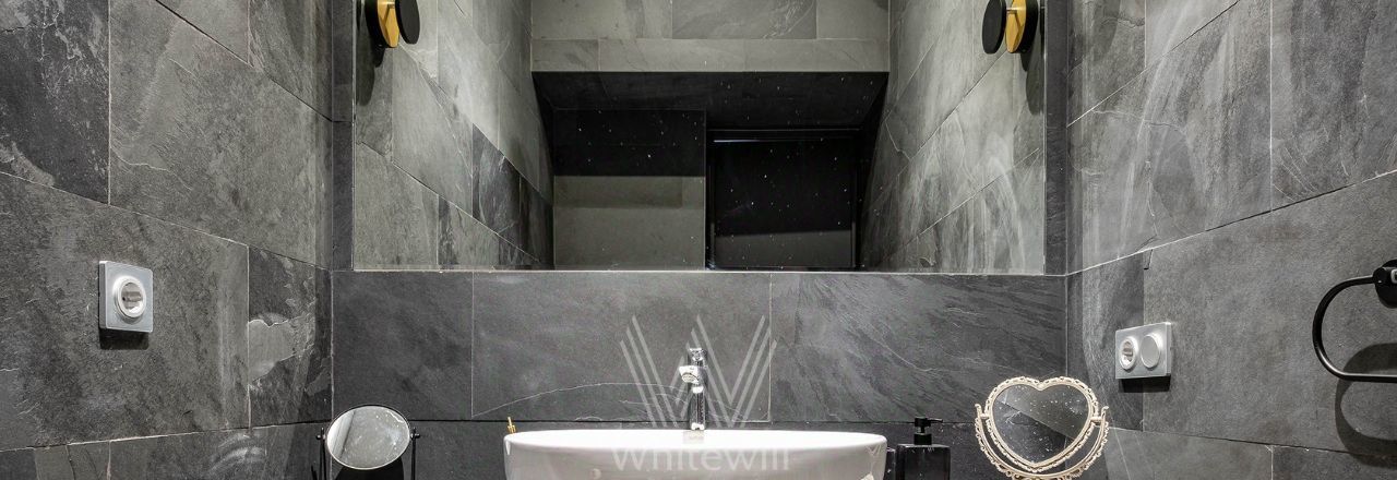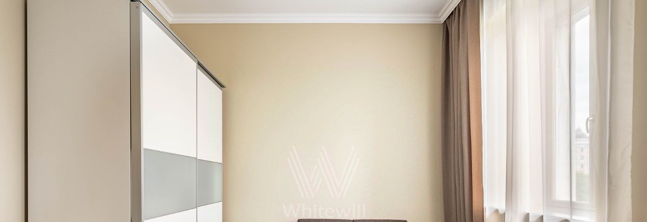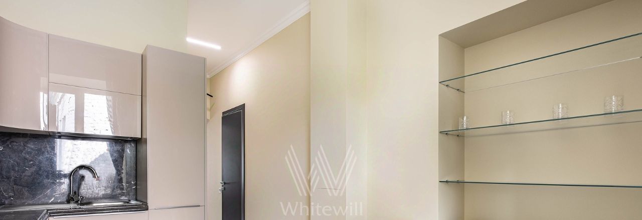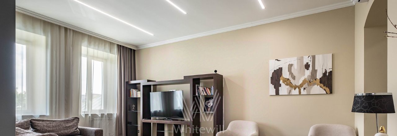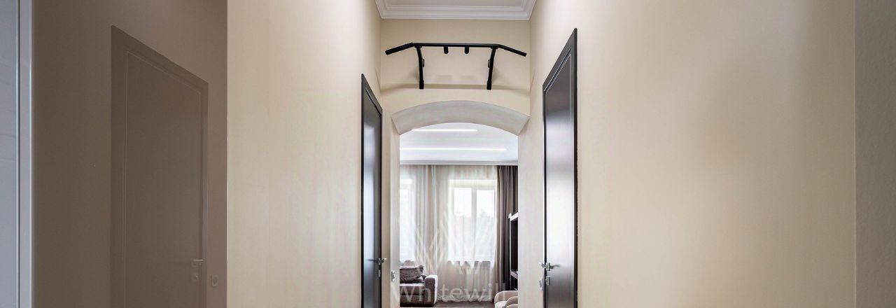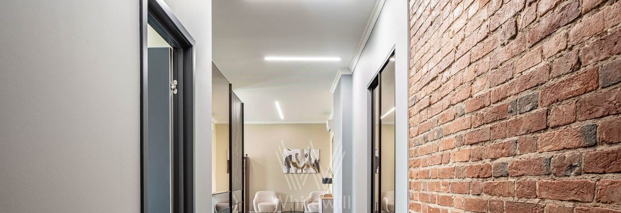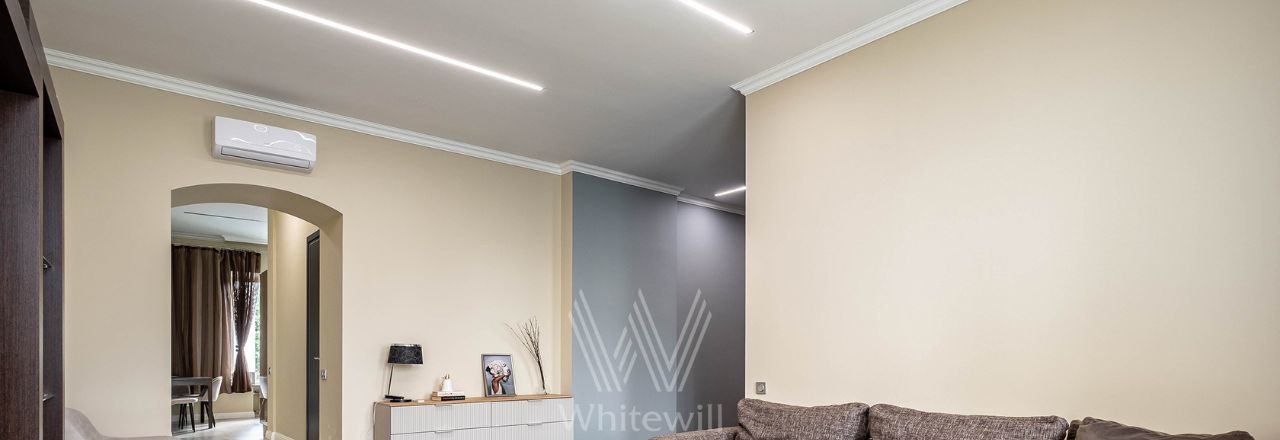 Квартира с 2-мя спальнями в историческом особняке у Тверского бульвара. Квартира общей площадью 95 м² расположена на последнем этаже. Выполнена дизайнерская отделка в современном стиле, часть стен оформлена открытой кирпичной кладкой. Большое количество окон и потолки высотой 3,2 метра наполняют пространство естественным светом.