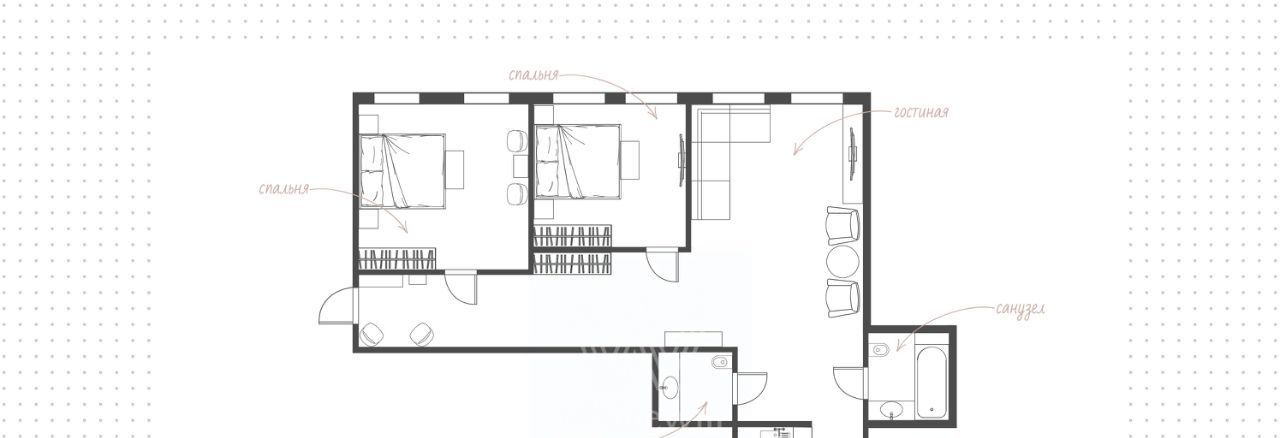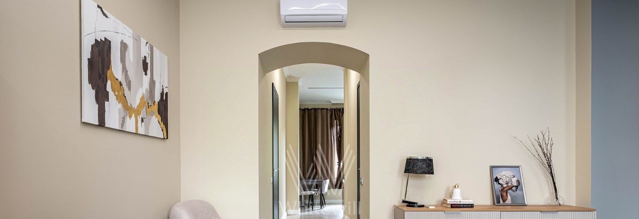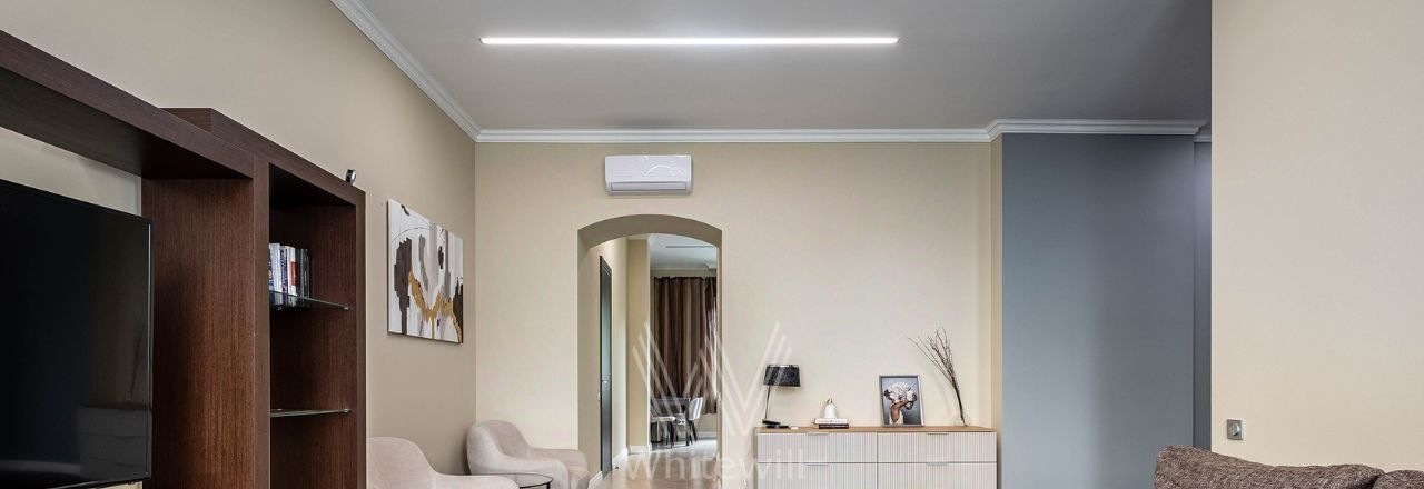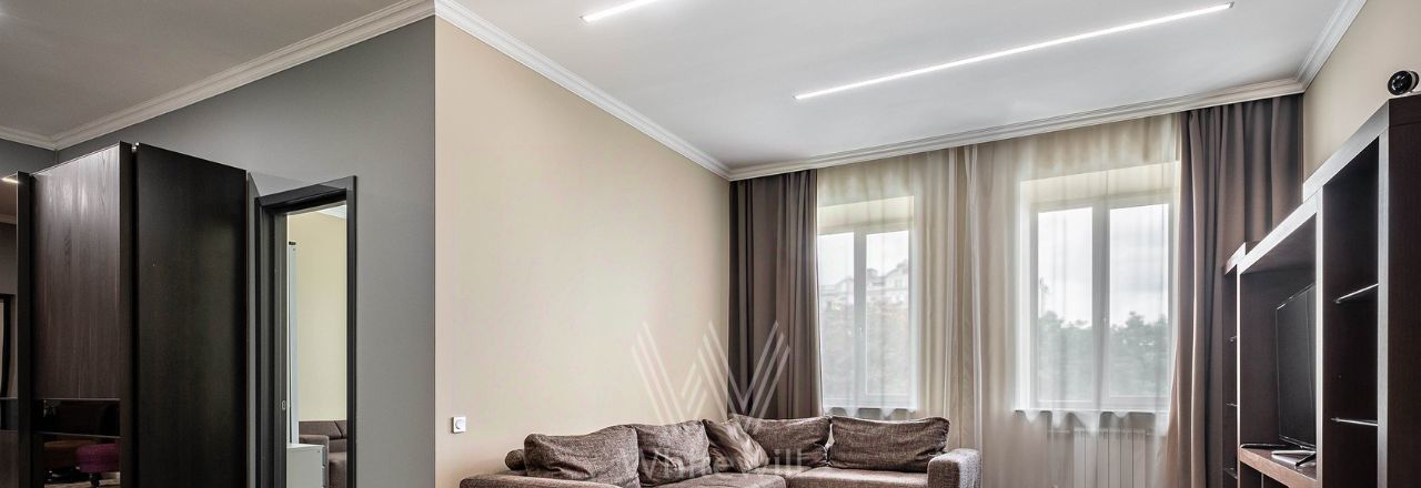 Спланирована просторная гостиная, кухня с обеденной зоной, 2 спальни, санузел с душевой, гостевой санузел, прихожая. Квартира полностью меблирована и оборудована бытовой техникой, установлены кондиционеры. Окна гостиной и спален выходят на улицу, окна кухни ориентированы в тихий двор. Предусмотрено машиноместо в закрытом дворе.