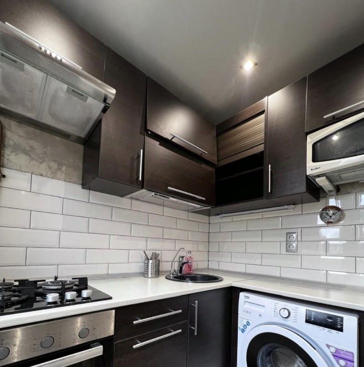 Кухня и санузел укомплектованы всем необходимым: встроенная мебель, холодильник, газовая плита с духовкой и вытяжкой, стиральная машина-автомат, ванная. Есть раскладывающийся диван, двуспальная кровать. Много места для хранения в гостиной.