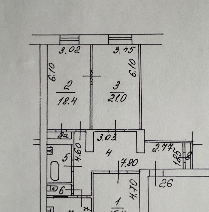 • В квартире 3 изолированных комнаты площадью 15,4 м2, 18,4 м2,