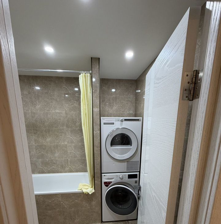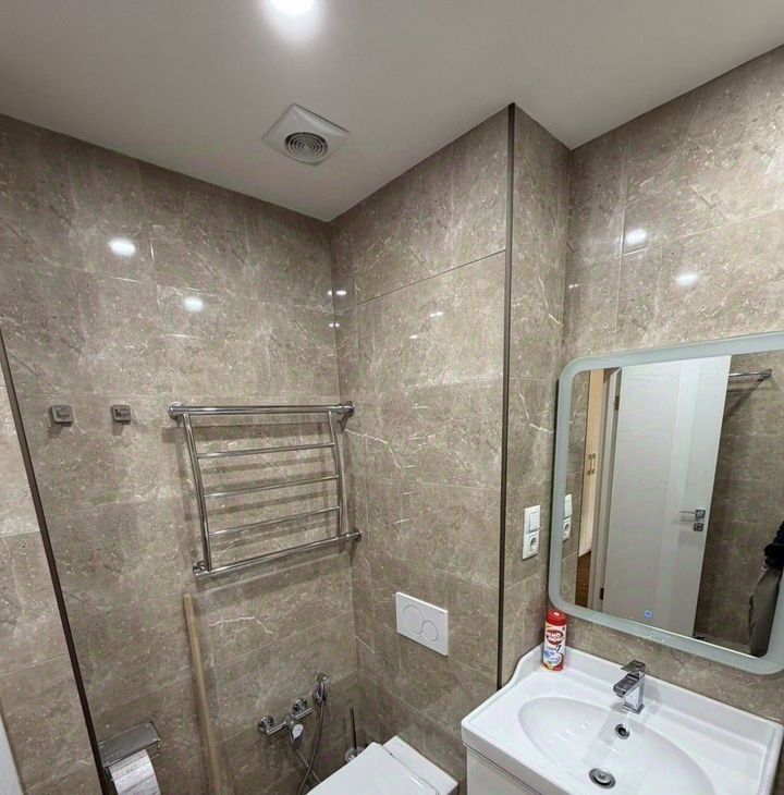 Санузел совмещенный, оформлен качественной плиткой, оснащен ванной ,стиральной и сушильной машиной.Из окон открывается вид на Преображенский рынок