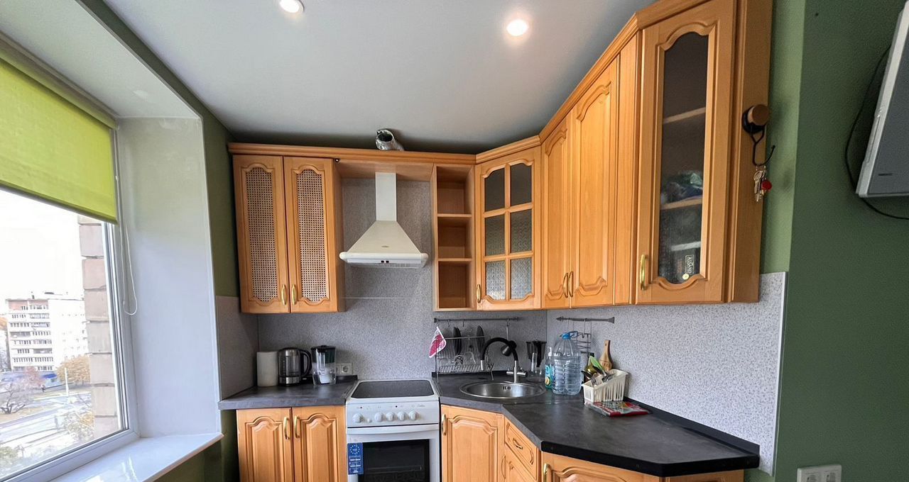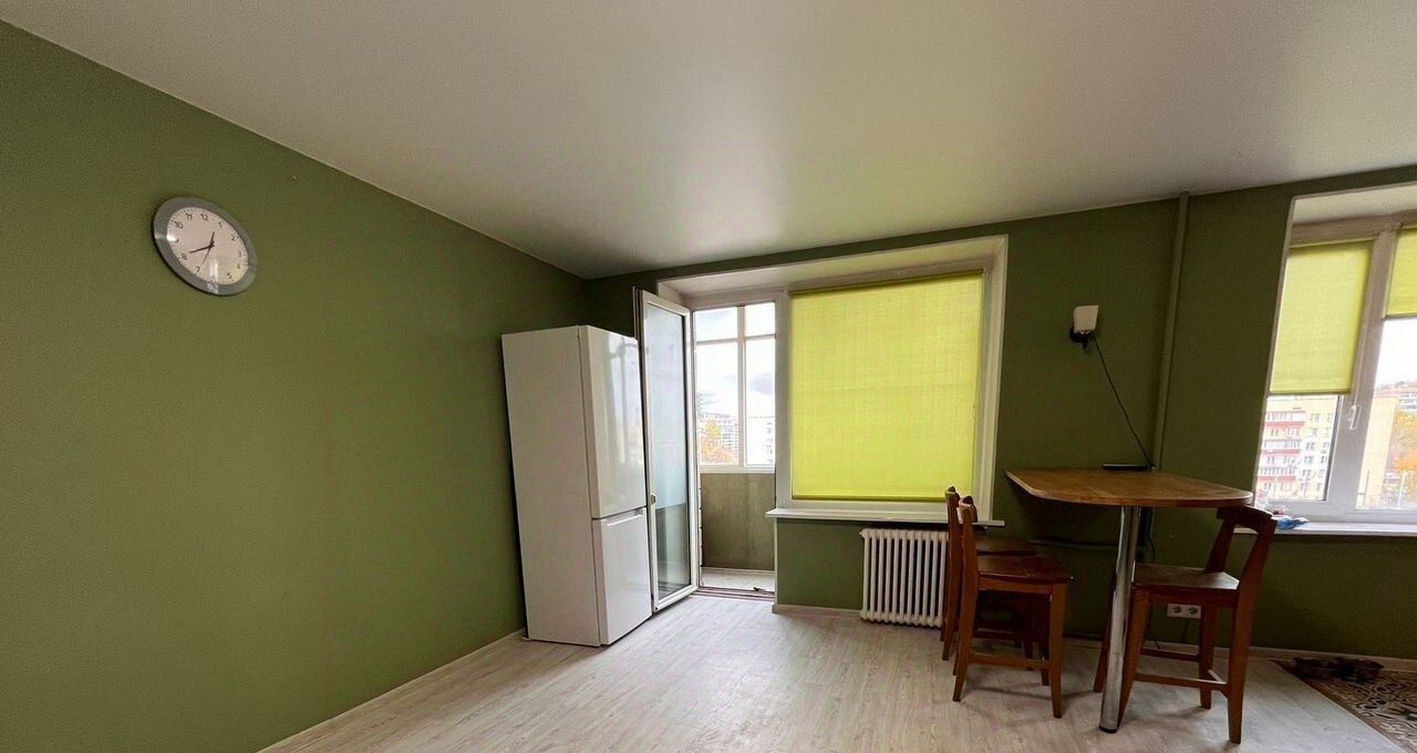 Кухня площадью 6 м² оснащена необходимой бытовой техникой, включая холодильник и стиральную машину. В комнате установлены шкафы для хранения вещей. Из окон открывается вид на город.
