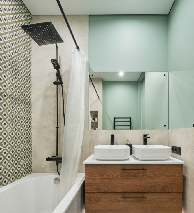 Отдельная ванная комната с ванной (villroy&boch), двумя раковинами и тёплым полом.