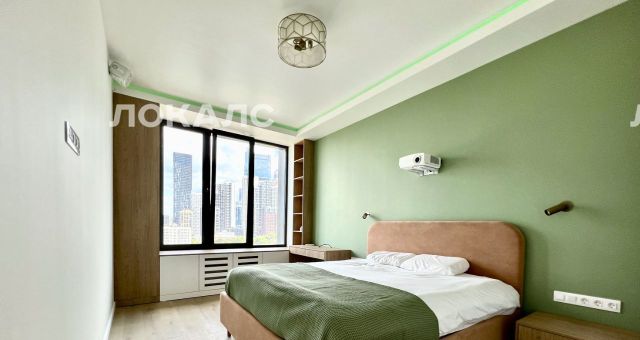 -Спальня 16 кв.м с рабочей зоной, с широким диван-подоконником у окна с видом на Сити, проектором JVC.