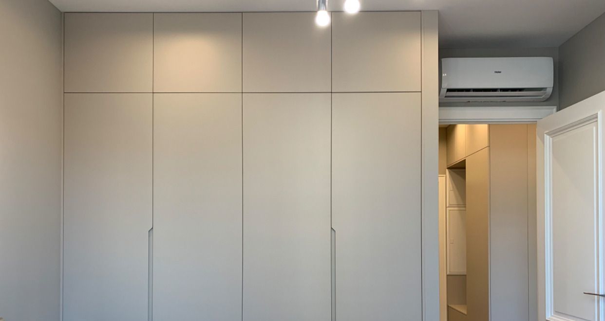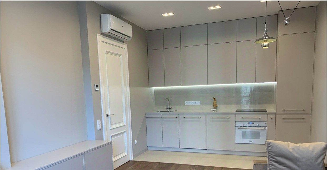 В гостиной есть: мягкая мебель, журнальный столик, комод под телевизор, на кухне: встроенный кухонный гарнитур со встроенной техникой: варочная панель с вытяжкой, духовой шкаф, посудомоечная машина, холодильник, в спальне: двуспальная кровать, встроенные шкафы, тумбочки, комната: встроенные шкафы, полностью оборудованная гардеробная, отдельно есть постирочная со стиральной машиной и гардеробной, прихожая: шкафы, есть бойлер, кондиционеры во всех комнатах. Там, где плитка сделан теплый пол, паркетная доска в комнатах и гостиной.