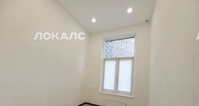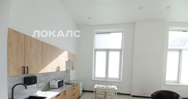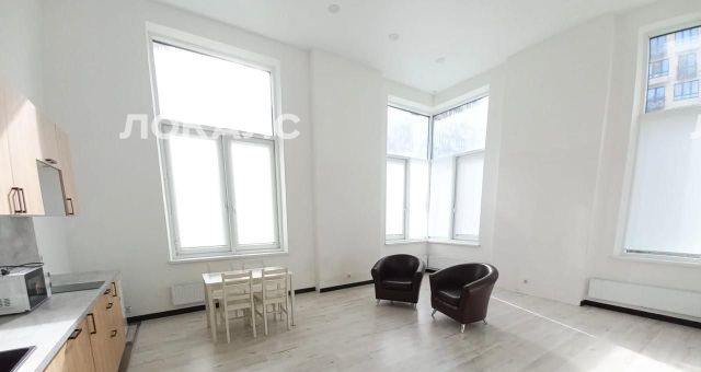Три отдельные комнаты, средняя объединена с кухонной группой. Высота потолков 5 метров. Два санузла : один с ванной, другой - гостевой туалет.Офисный ремонт, из мебели : встроенная кухня, холодильник, диван. Вход в квартиру из подъезда, дом находится внутри закрытой ухоженный территории "двор без машин".