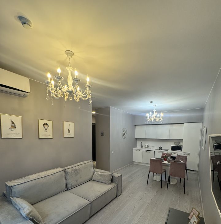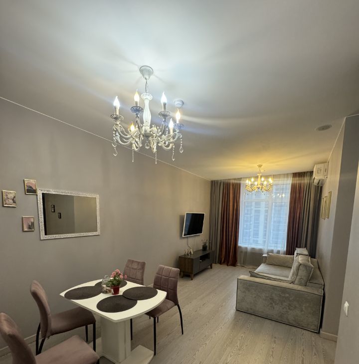 Современная евро-двушка ( две изолированные спальни и кухня гостиная совмещенна)Есть вся мебель и техника (ТВ, интернет, кондиционеры, стиральная машина, посудомоечная машина )большая ванна, душевая кабина, высокие потолки, большая кровать в спальне, в гостиной - раскладывающийся диван, во второй спальне раскладывающийся диван, письменный стол.