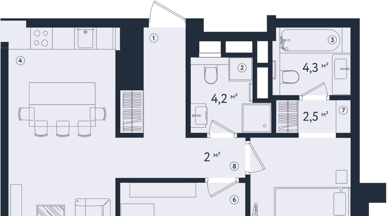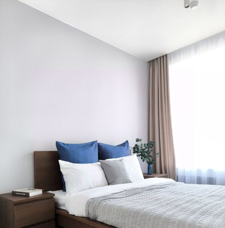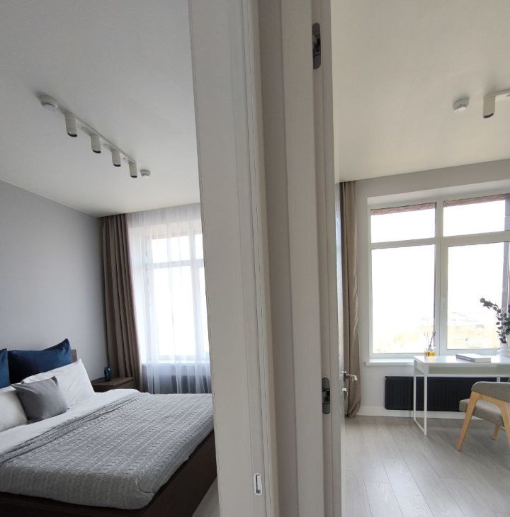 В квартире тщательно проработанная современная планировка: две изолированные спальни, два санузла и объединенная кухня-гостинная 21 метр. Мастер-спальня с отдельным санузлом с ванной. В гостевом санузле установлена душевая кабина и выделена постирочная зона.