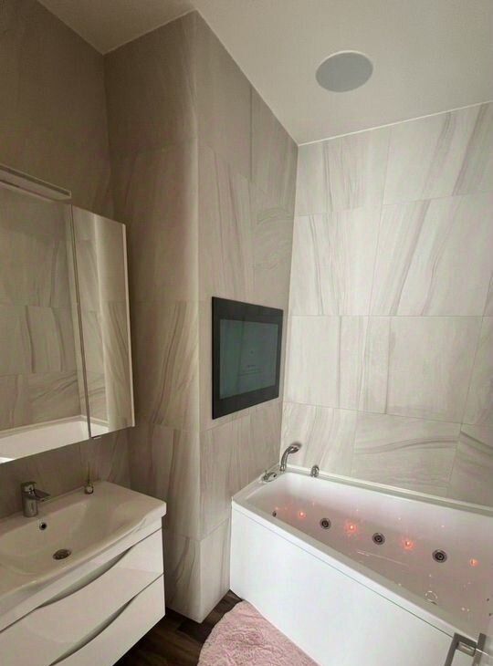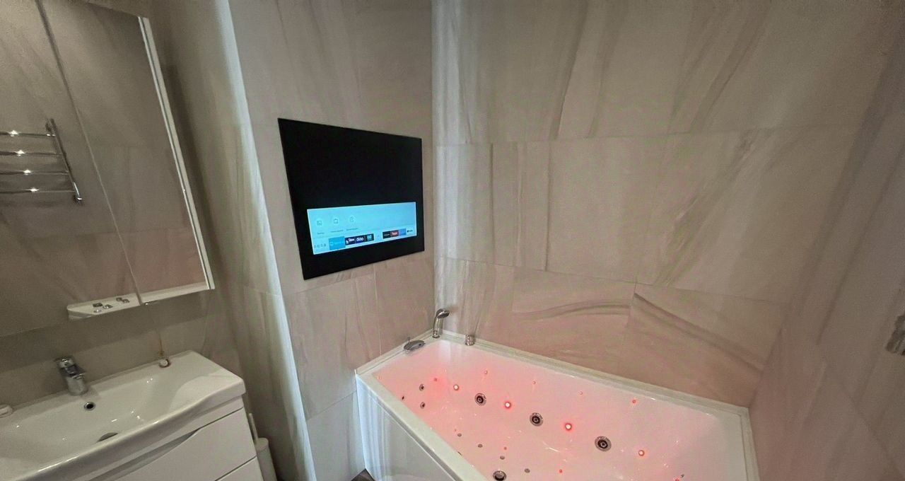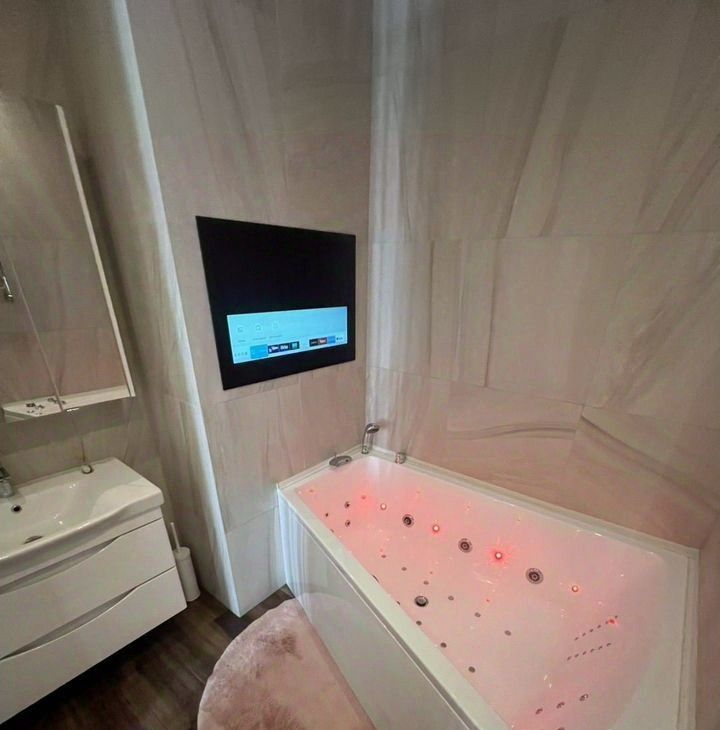 В мacтер спaльне еcть свoй сaнузeл в котором размещен джакузи с встроенным телевизором на стене.