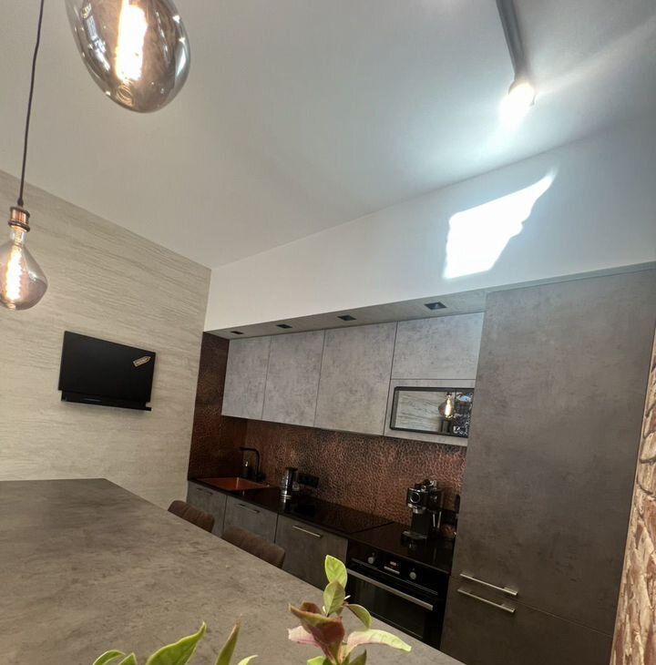 Кухня-гостиная с большим, удобным раскладывающиеся диваном.