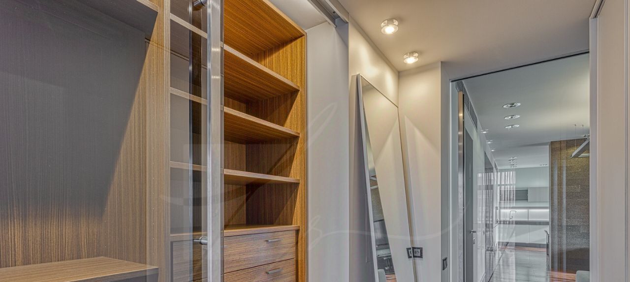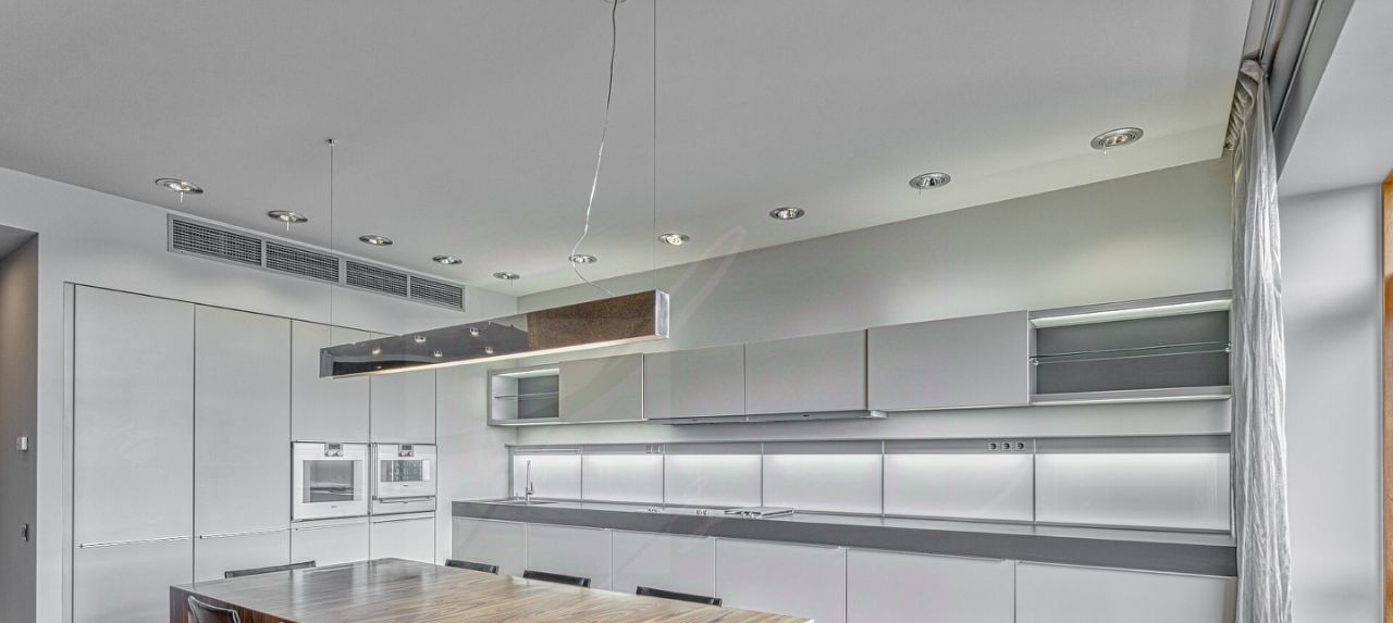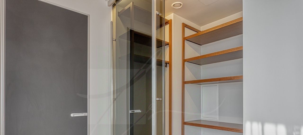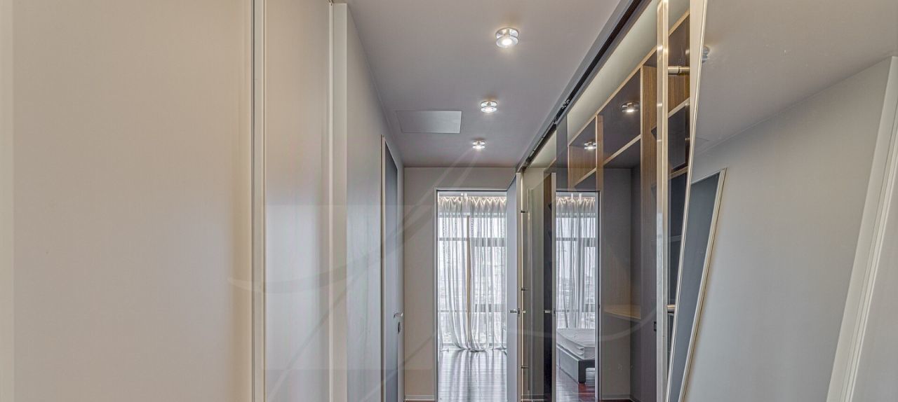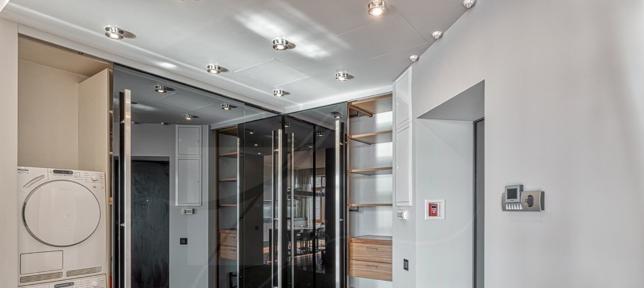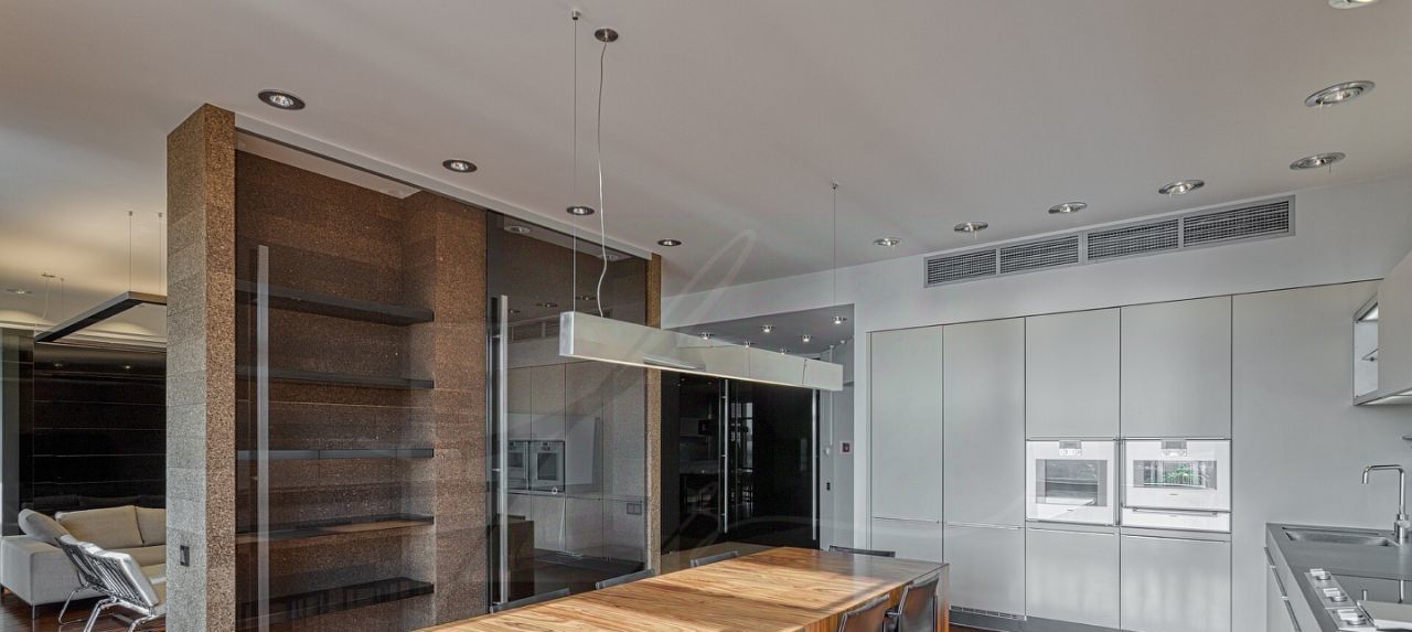 Дизайнером спланировано комфортное пространство гостиной, кухонно-столовой зоны, 2 спальни со своими санузлами и зонами гардероба, кабинетной зоной. В квартире 2 большие лоджии. Кондиционирование осуществляется с помощью системы фанкойл. Кухня оснащена премиальной бытовой техникой гаггенау: 2 холодильника, 2 морозильных зоны, посудомоечная машина, стиральная машина, вытяжка, духовой шкаф, микроволновая печь, варочная поверхность, гриль на углях. В квартире два совмещённых санузла: в одном душевая кабина, в другом — ванна.