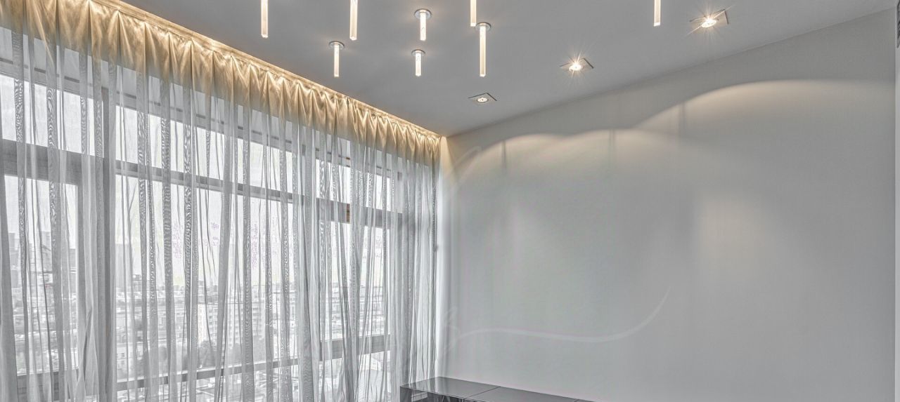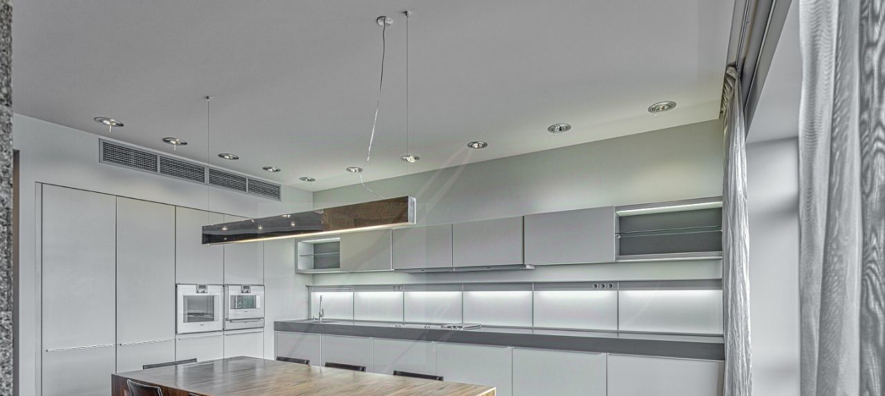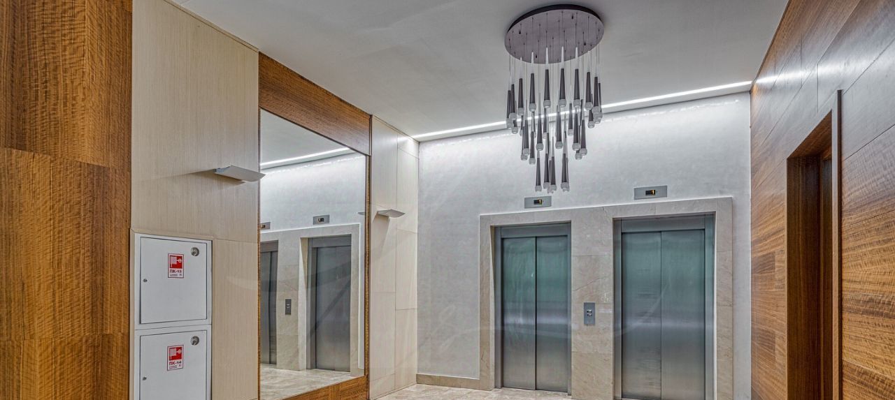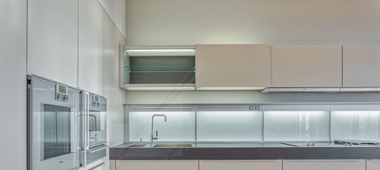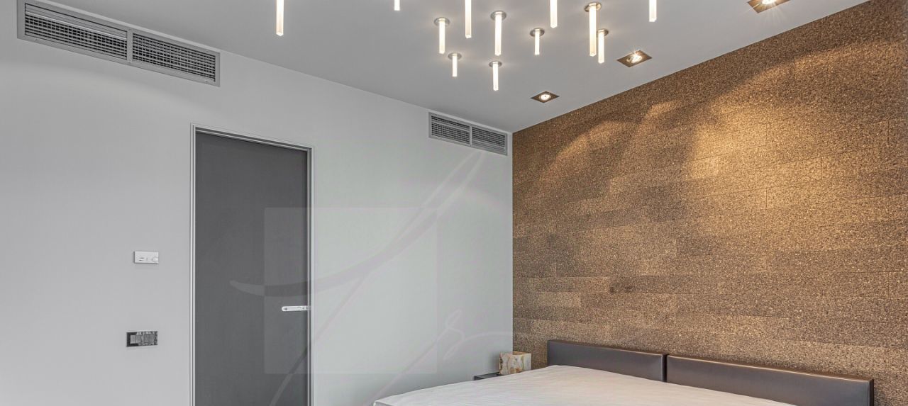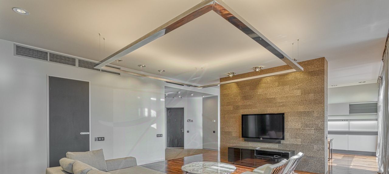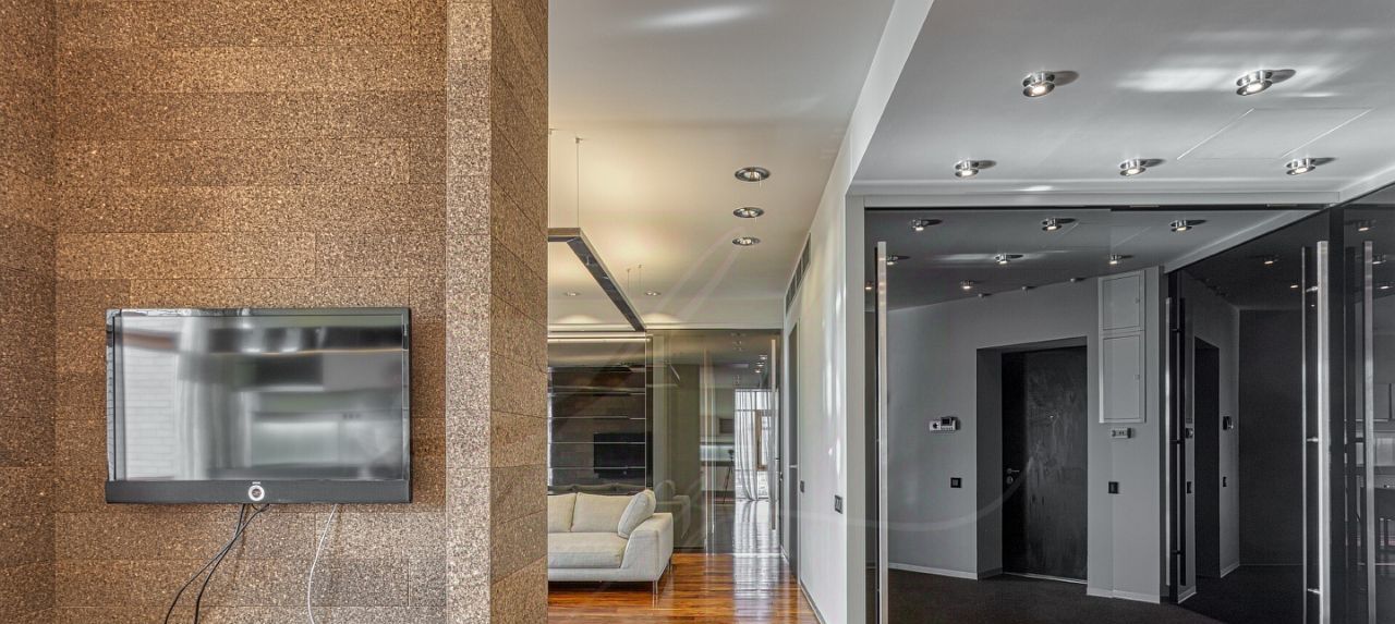 Дизайнером спланировано комфортное пространство гостиной, кухонно-столовой зоны, 2 спальни со своими санузлами и зонами гардероба, кабинетной зоной. В квартире 2 большие лоджии. Кондиционирование осуществляется с помощью системы фанкойл. Кухня оснащена премиальной бытовой техникой гаггенау: 2 холодильника, 2 морозильных зоны, посудомоечная машина, стиральная машина, вытяжка, духовой шкаф, микроволновая печь, варочная поверхность, гриль на углях. В квартире два совмещённых санузла: в одном душевая кабина, в другом — ванна.