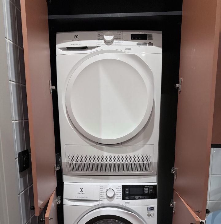 Здесь есть все необходимое для комфортного проживания: современная мебель на кухне и в комнатах, а также полный комплект техники — кондиционер, холодильник, посудомоечная машина, телевизор, кулер и стиральная машина. Для вашего удобства в квартире два совмещенных санузла, а также ванна и душевая кабина.