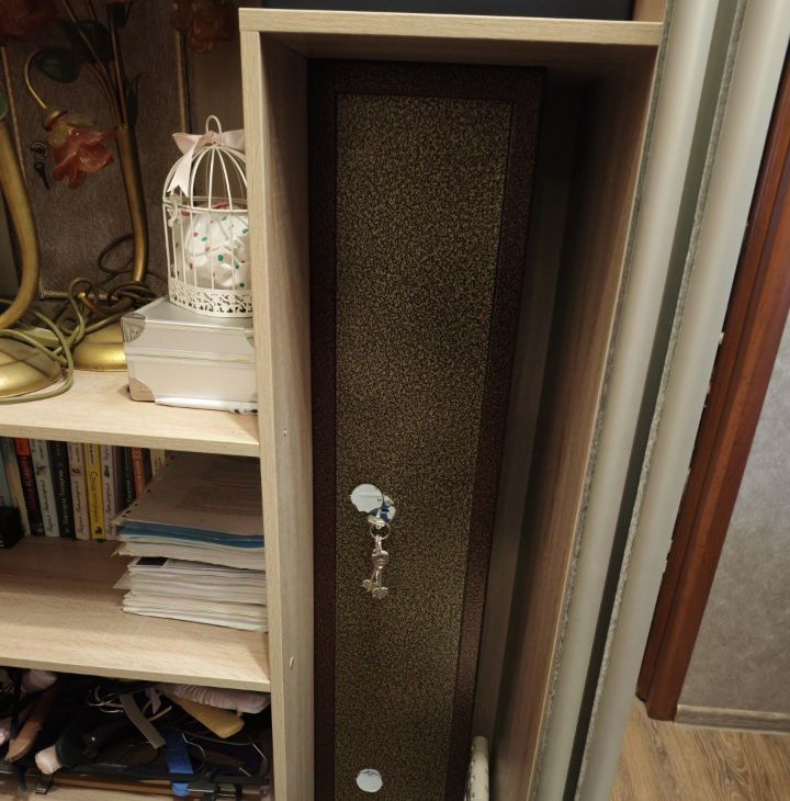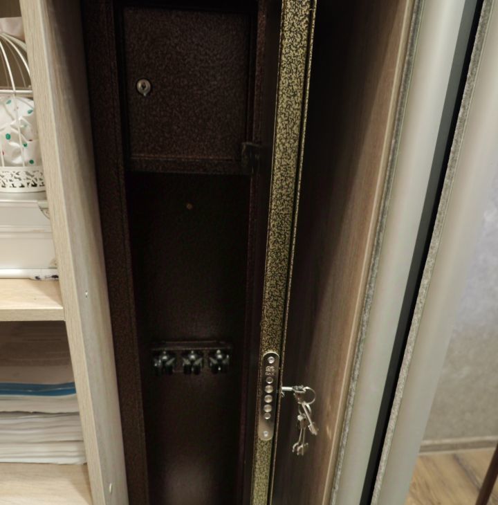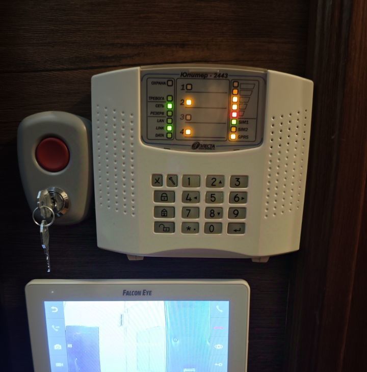 Сигнализация (охранная система), видеодомофон, бронированная дверь, сейф для оружия.