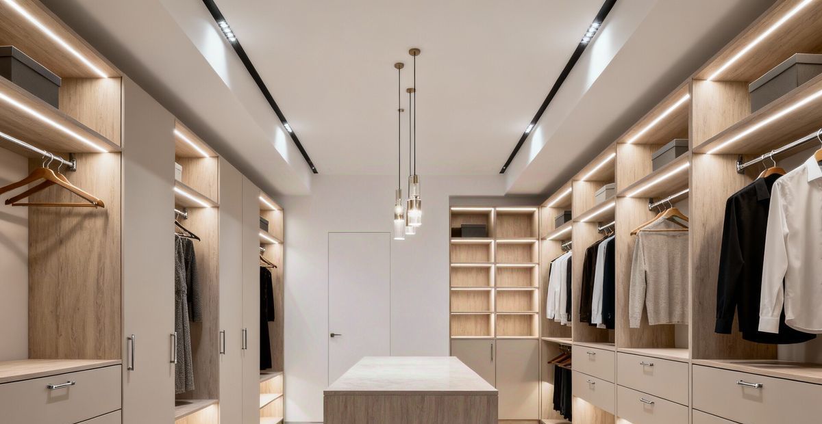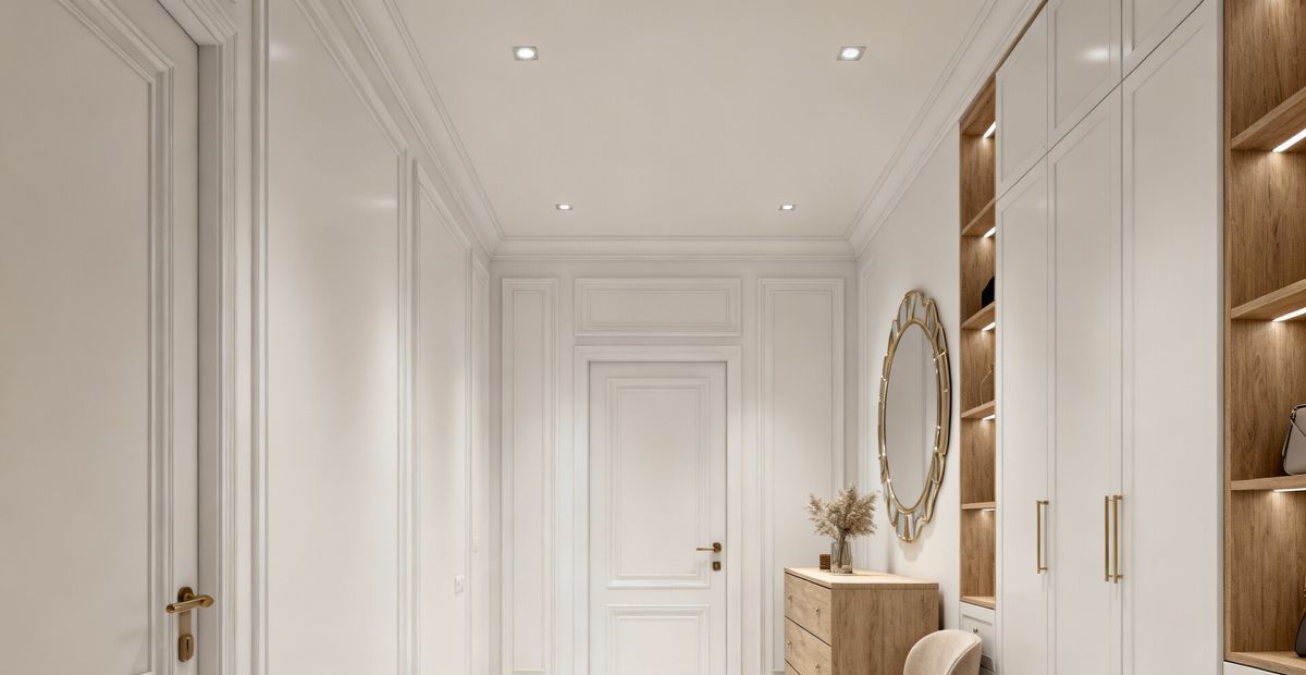 Просторная гардеробная, организующая хранение без лишних деталей в интерьере