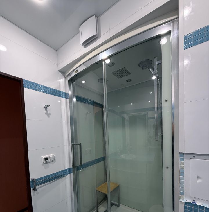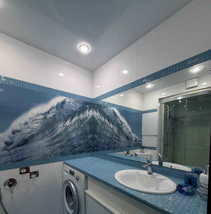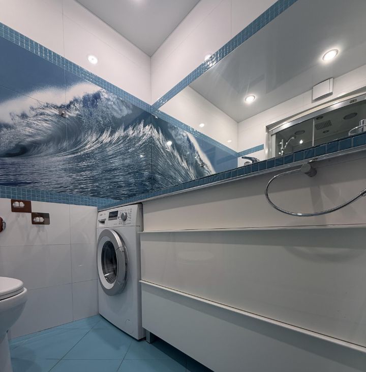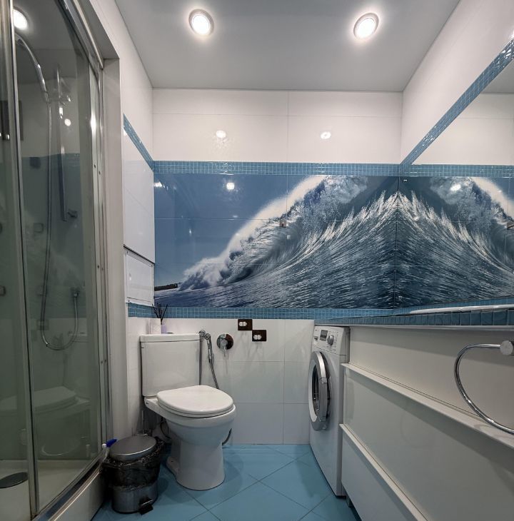 Совмещённый, с душевой кабиной и стиральной машиной.