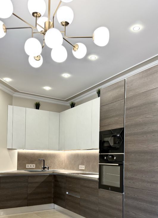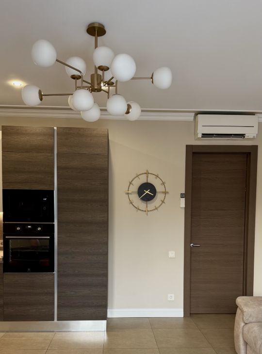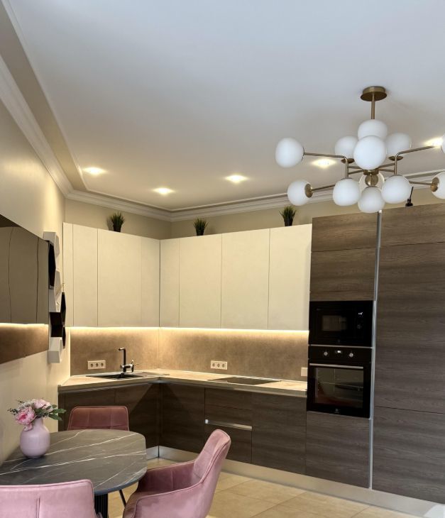 Имеет Итальянскую кухню Aran,со встроенной микроволновкой ,духовым шкафом ,посудомоечной машиной 60 см,индукционной варочной панелью- это все фирмы Electrolux!