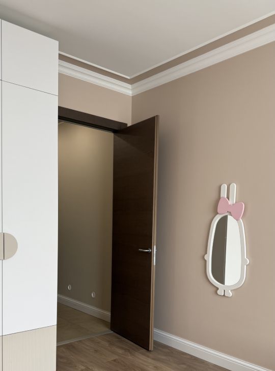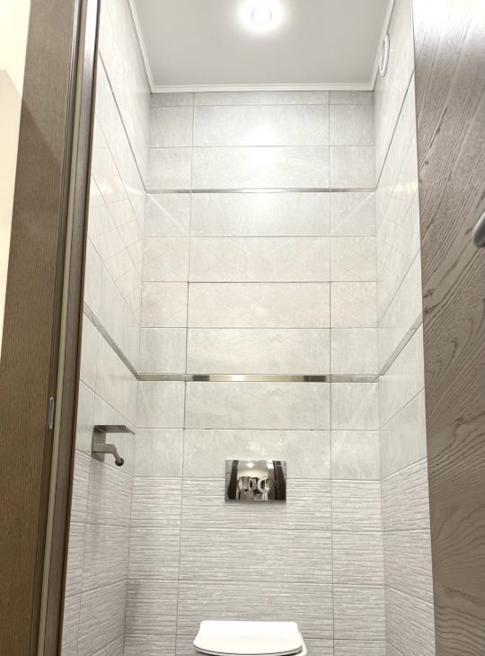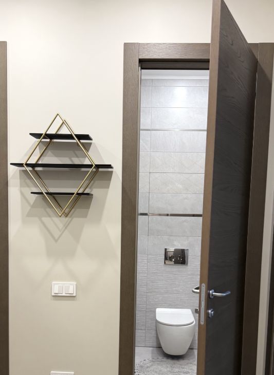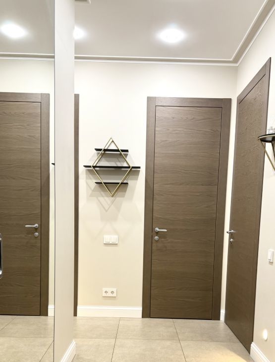 Двери во всей квартире со скрытыми петлями ,и коробом обратного открывания ,из натурального шпона высотой 2.30 фирмы Волховец в дорогом дымчатом цвете !