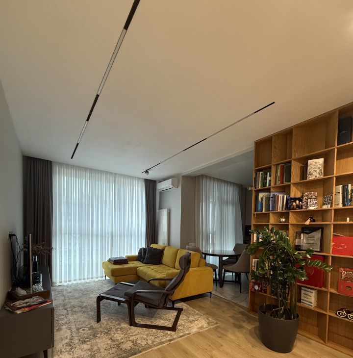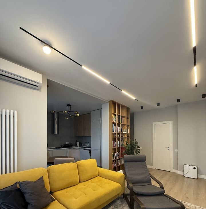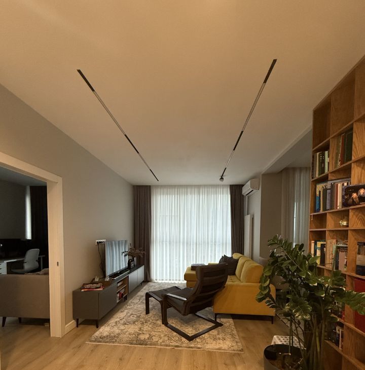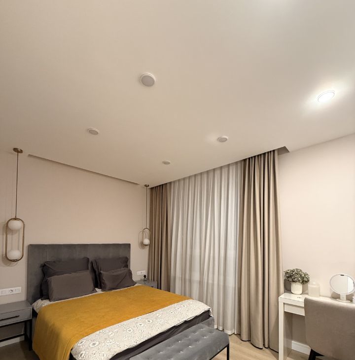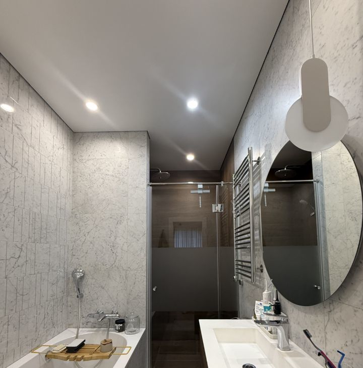Потолки - в жилых комнатах и гостиной - гипсокартоновые потолки, в санузлах и на кухне - натяжные потолки с теневым профилем