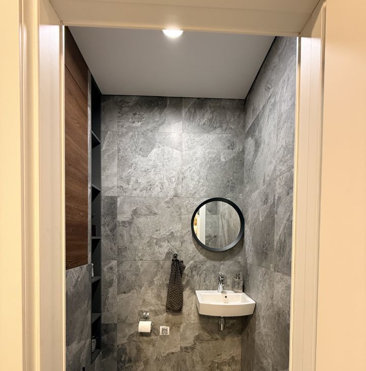 Туалет - инсталляция Geberit, подвесной унитаз Villeroy & Boch, раковина для мытья рук, встроенный шкаф над инсталляцией с открытыми полками.