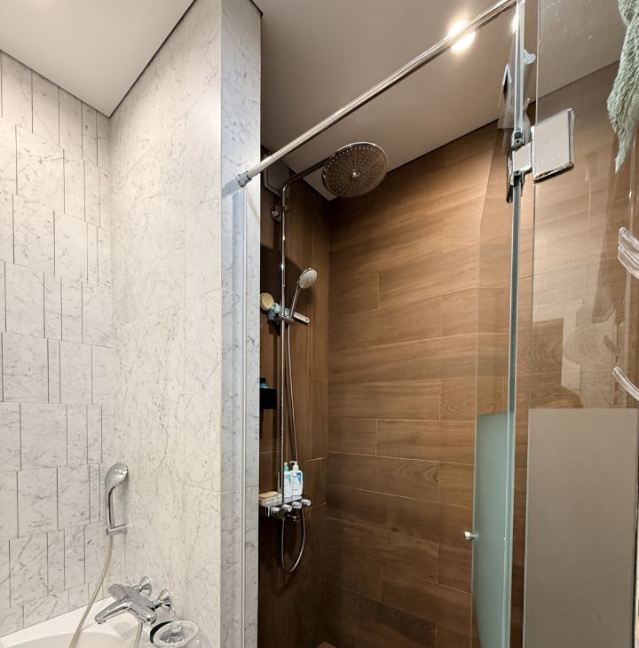 Ванная комната с отдельным тропическим душем. Душевая система и смеситель с терморегулятором марки Grohe, ванна Villeroy & Boch. Раковина из искусственного камня на подвесной тумбе с 2-мя ящиками.