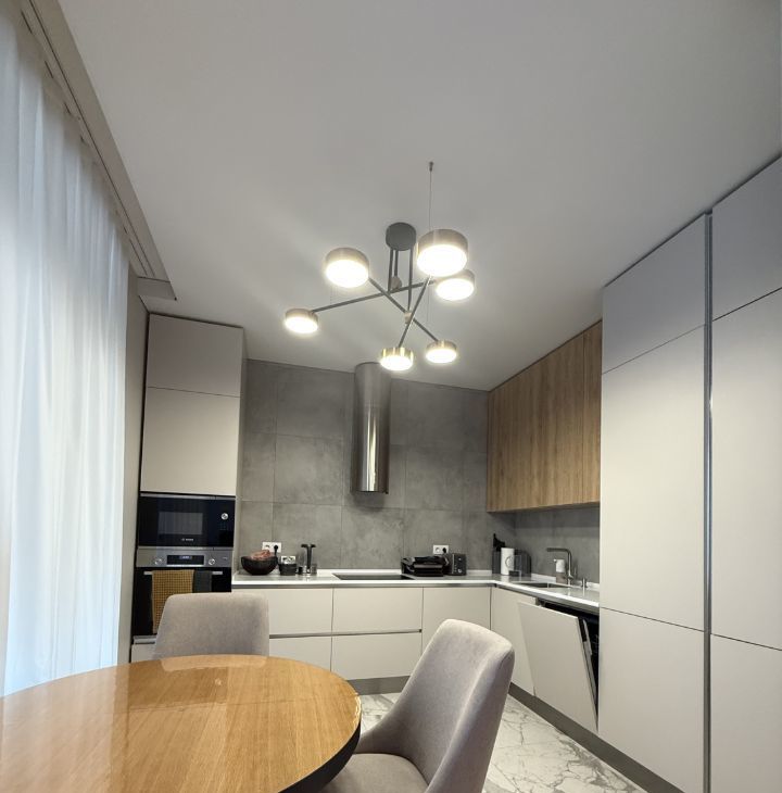 Кухня - площадь 11 кв. м., встроенная угловая кухня со столешницей из искусственного камня с полным набором встроенной техники - СВЧ, духовка, варочная панель (все - Bosch), стиральная машина и посудомоечная машина (обе - Electrolux), холодильник (Samsung), вытяжка Elica. Круглый раздвижной кухонный стол с набором мягких стульев.