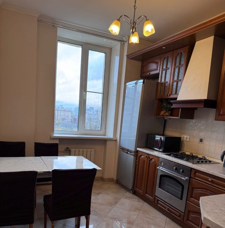 Кухня- встроенный кухонный гарнитур, плита, духовка, большой холодильник, свч-печь, чайник, стол и стулья.