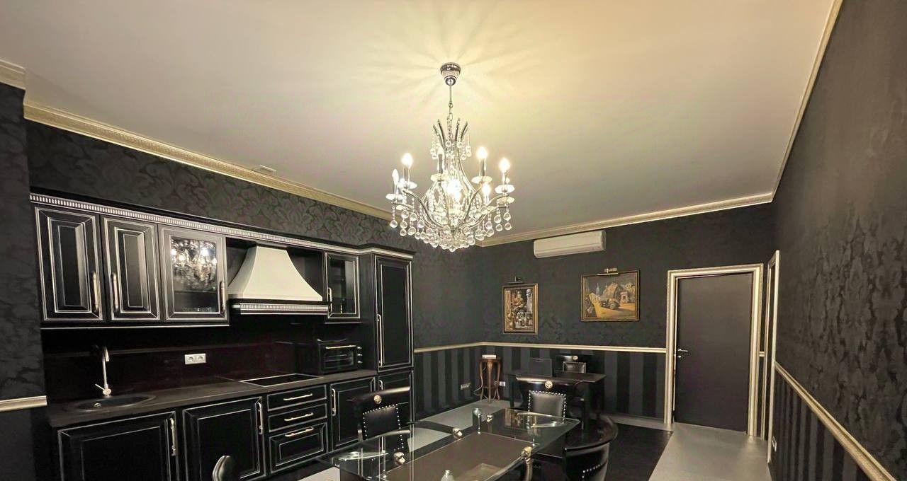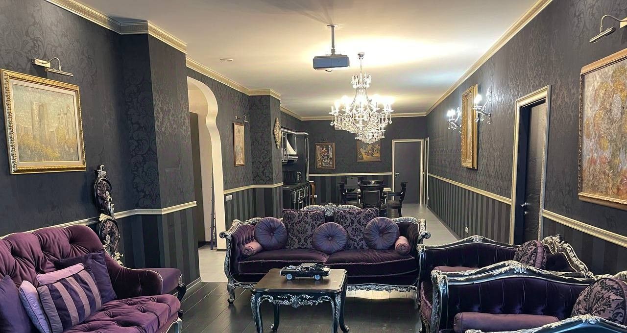 Вся необходимая мебель и техника. В гостиной домашний кинотеатр с проектором.