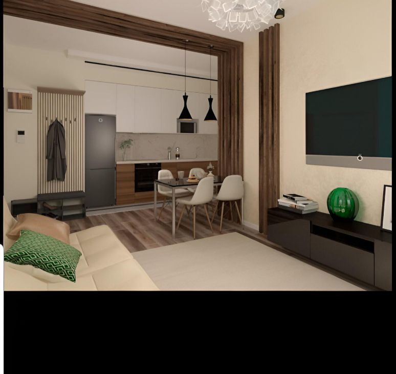 В квартире имеется полностью оборудованная кухня-гостиная, спальня, детская-кабинет,санузел, гардеробная.