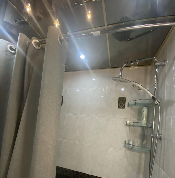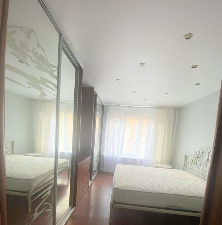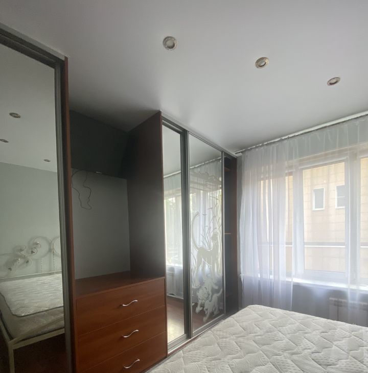 Планировка : кухня - гостиная с обеденной зоной . Новый гарнитур , диван . Большая вместительная гардеробная , электрический камин. Спальня с двухместной кроватью ( кровать выполнена в виде ковки) , вместительная гардеробная с разделенными секциями . Жилая комната ( можно использовать как детскую или кабинет) . Совмещенный санузел ( новая ванна)