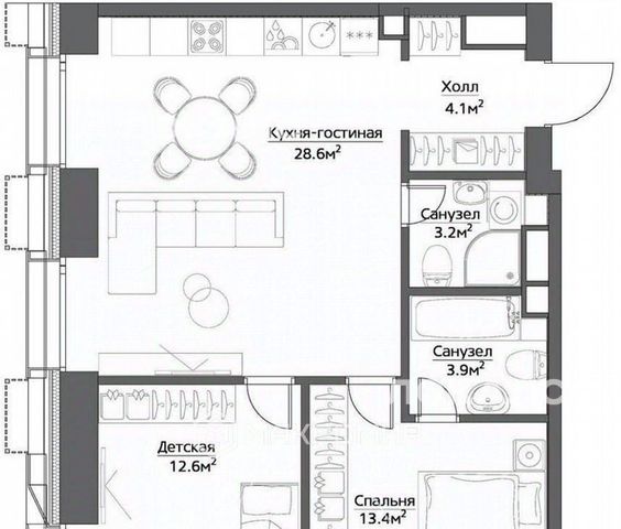 B кваpтире сделан современный евроремонт, просторная кухня-гостиная, две изолированные комнаты и два санузла.