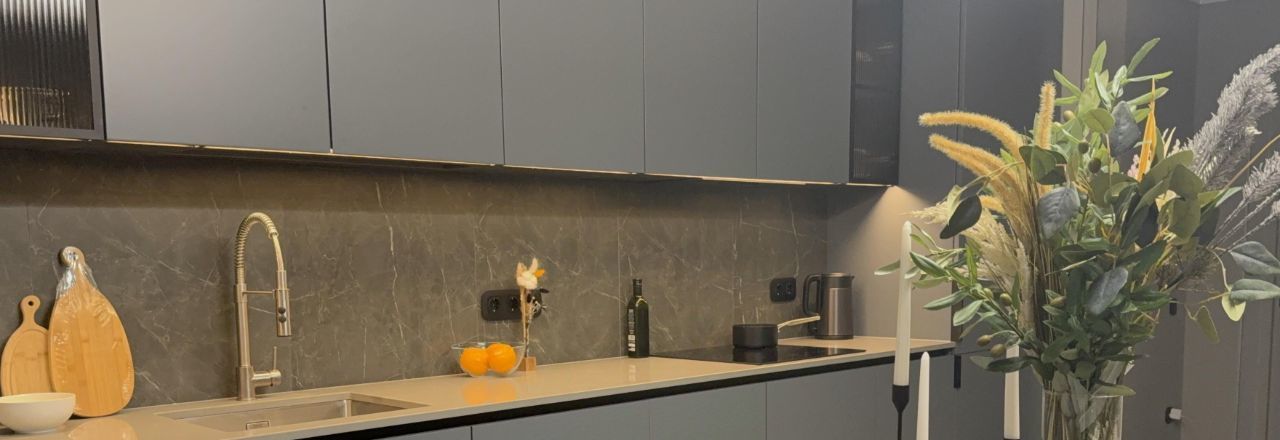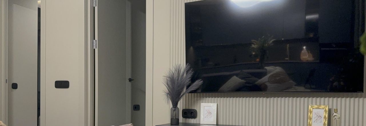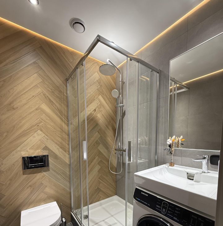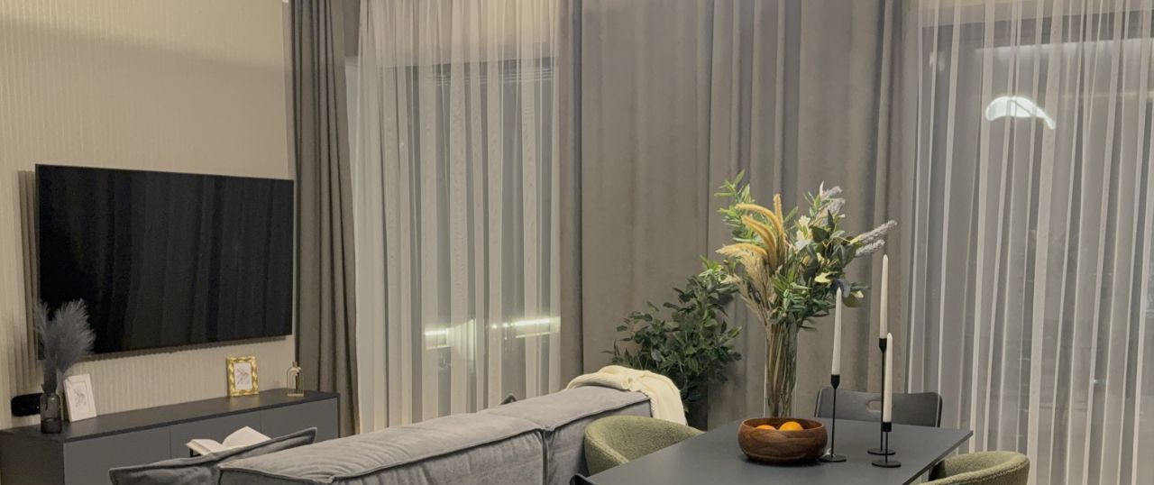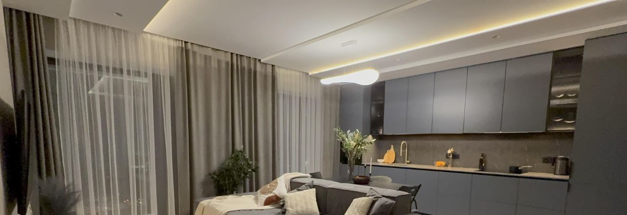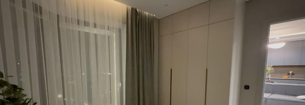 Квартира сдается со всей необходимой мебелью и техникой: посудомоечная и стиральная машины, духовой шкаф, варочная плита, микроволновая печь, кондиционеры, диван, кровать, телевизор, места для хранения, вариация освещения.