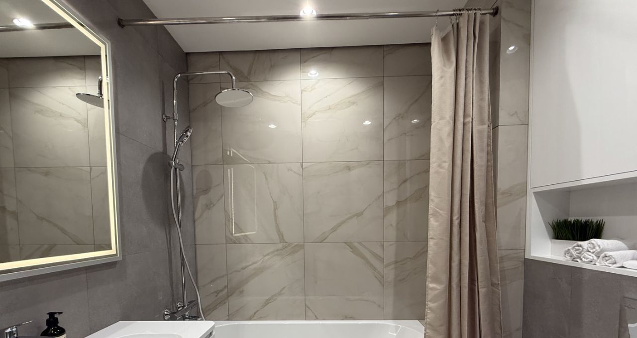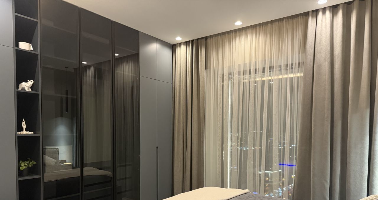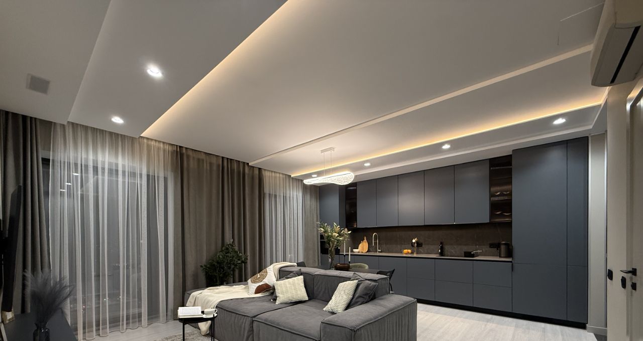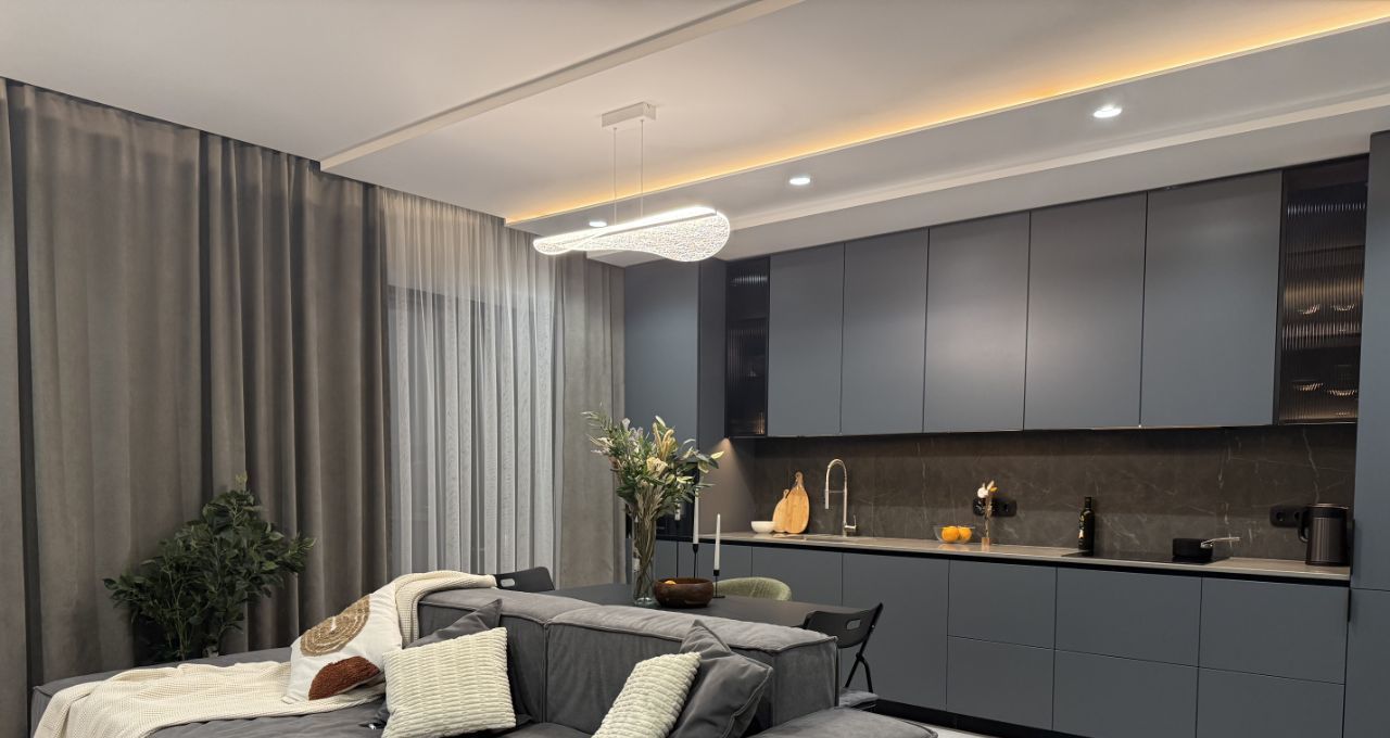 Квартира сдается со всей необходимой мебелью и техникой: посудомоечная и стиральная машины, духовой шкаф, варочная плита, микроволновая печь, кондиционеры, диван, кровать, телевизор, места для хранения, вариация освещения.
