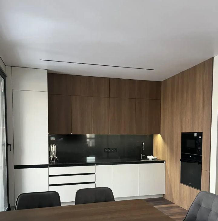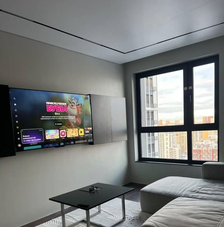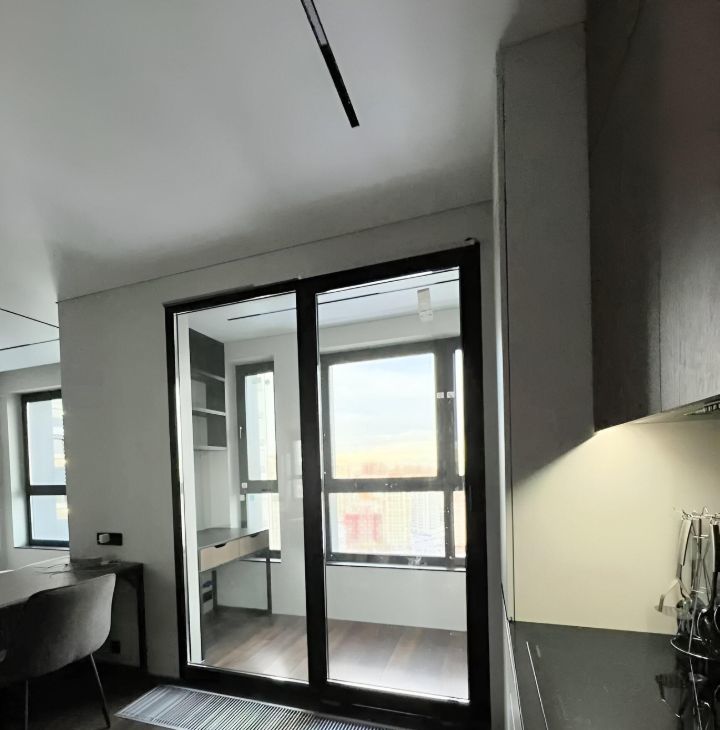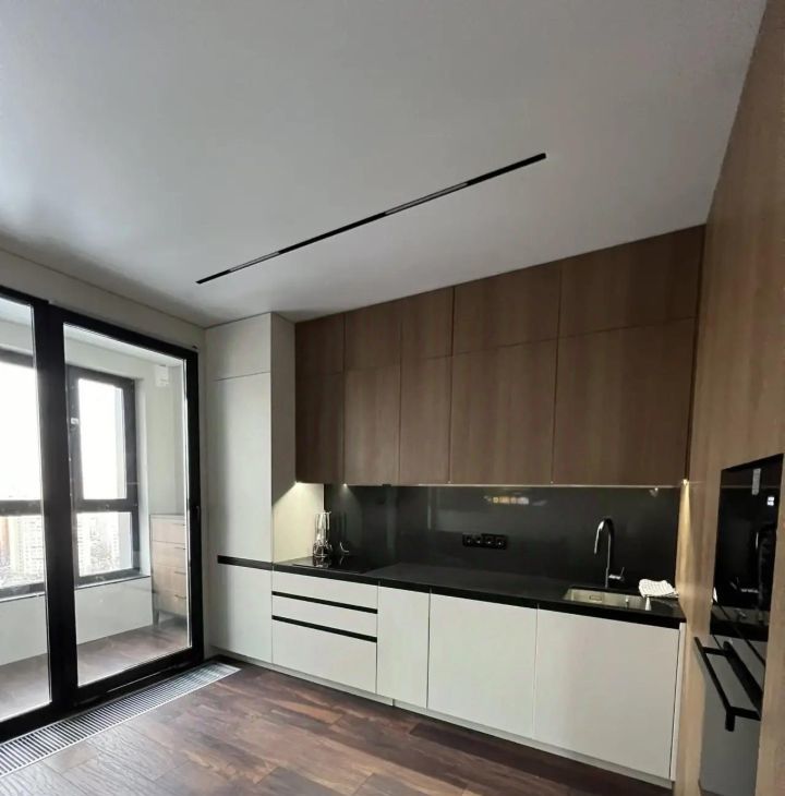 Кухня впечатляет своими размерами — 31 м², оснащена современной техникой, включая встроенный холодильник, духовой шкаф, посудомоечную машинку и встроенную микроволновую печь. Просторная гостиная с выходом на застекленную лоджию, где можно наслаждаться видом на городские пейзажи.