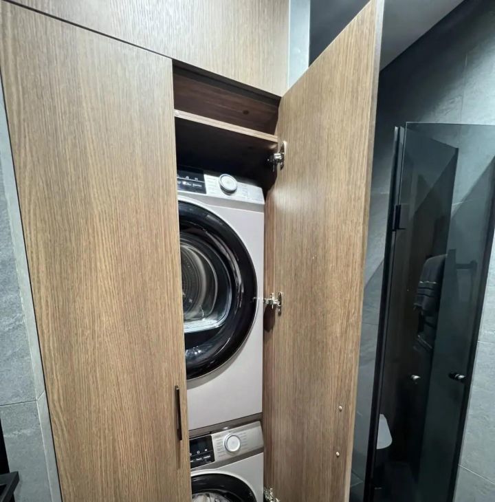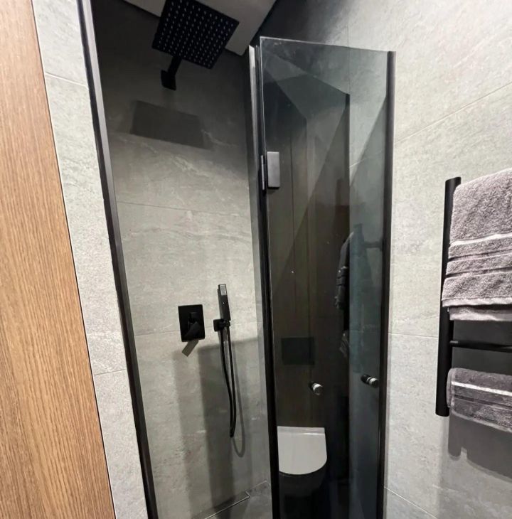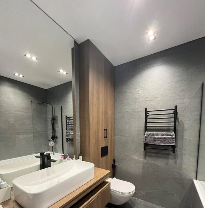 В ванной комнате стильная отделка, раздельный санузел с душевой кабиной. Встроенные шкафы обеспечивают достаточно места для хранения вещей.
