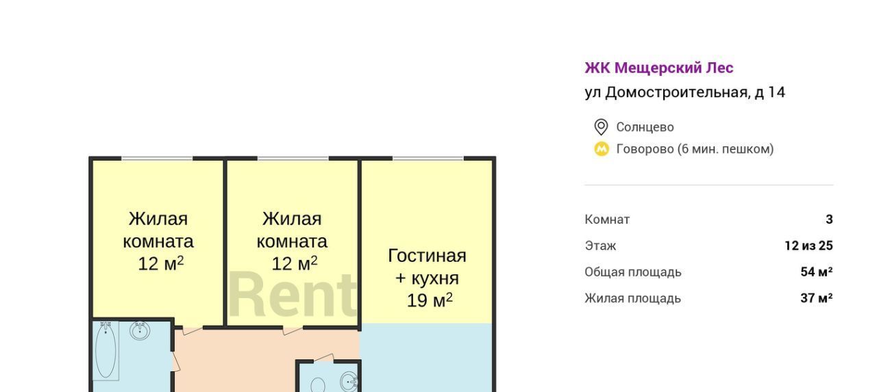 Предлагается 3-комнатная квартира общей площадью 54 м² в ЖК "Мещерский Лес" недалеко от станции метро "Говорово". Кухонный гарнитур оснащен посудомоечной машиной, духовой печью. Окна обращены на улицу.
