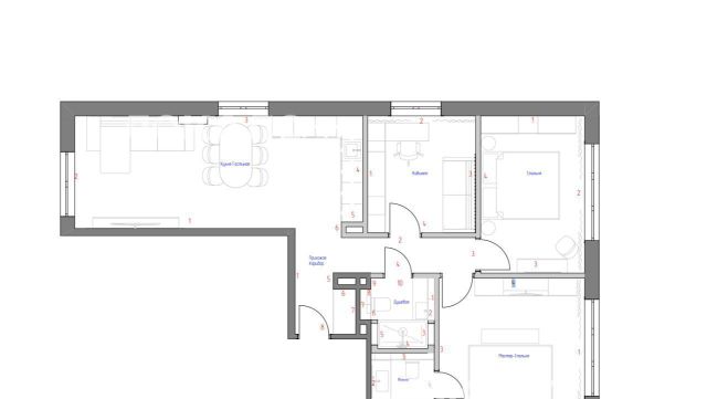 Квартира с функциональной планировкой, распашонка, окна смотрят во двор, 3 изолированные комнаты, мастер спальня, оборудована собственным санузлом и ванной -17,2 кв.м., спальня 12,8 кв.м., кабинет 9,95 кв.м. Высота потолков 3 метра, современная кухня-гостиная 25,1 кв.м. Второй санузел (гостевой), оборудован душевой кабиной.