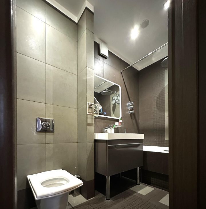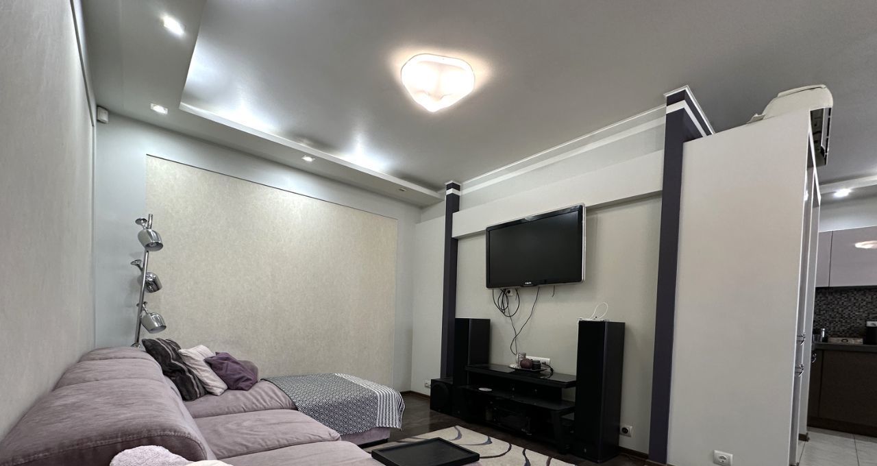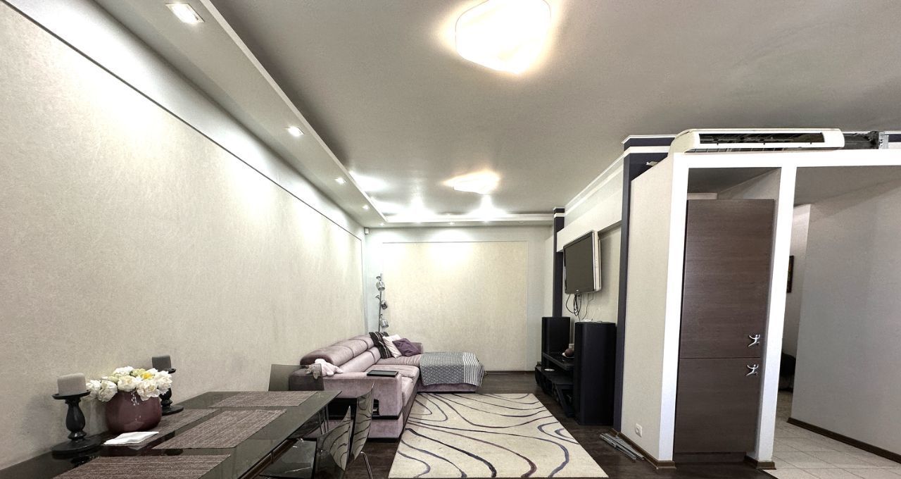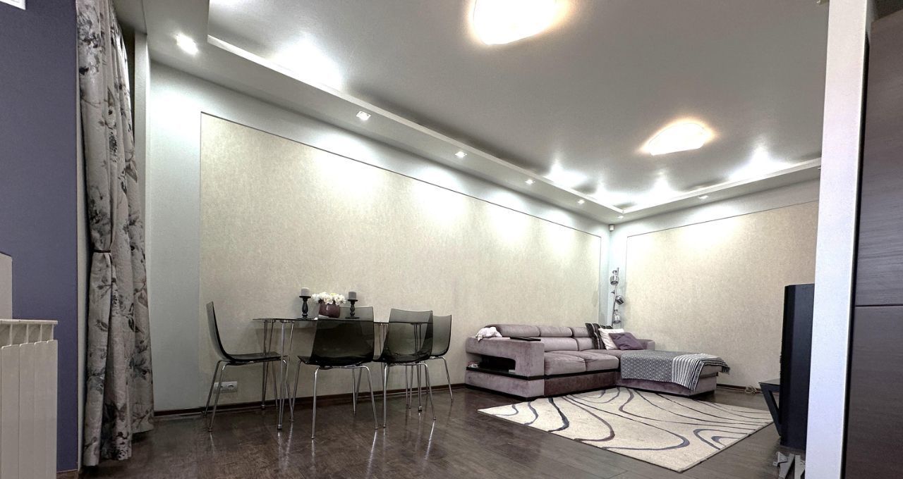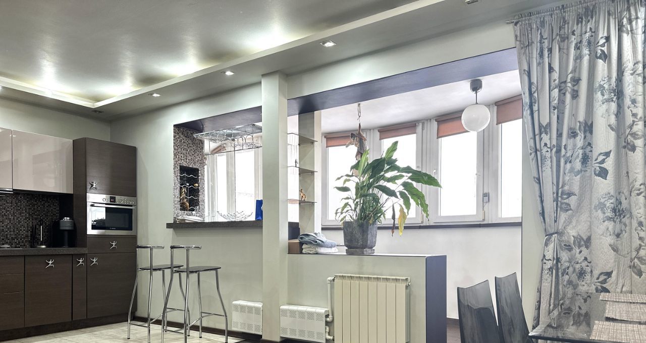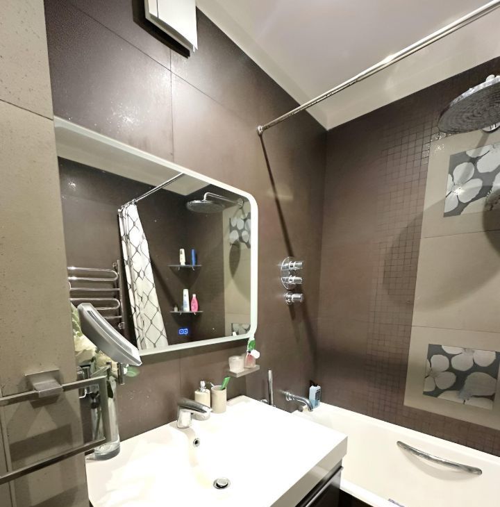 В квартире выполнен дизайнерский ремонт, имеется большая кухня - гостиная с выходом на просторную лоджию, две отдельные комнаты и самостоятельная гардеробная комната, санузел совмещенный, имеется ванна.