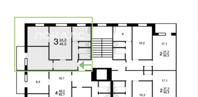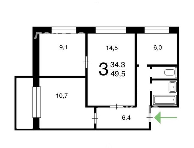 Общая площадь 49,5 м². Жилая 34,3 м² (комнаты 14,5 м², 10,7 м² и 9,1 м²).