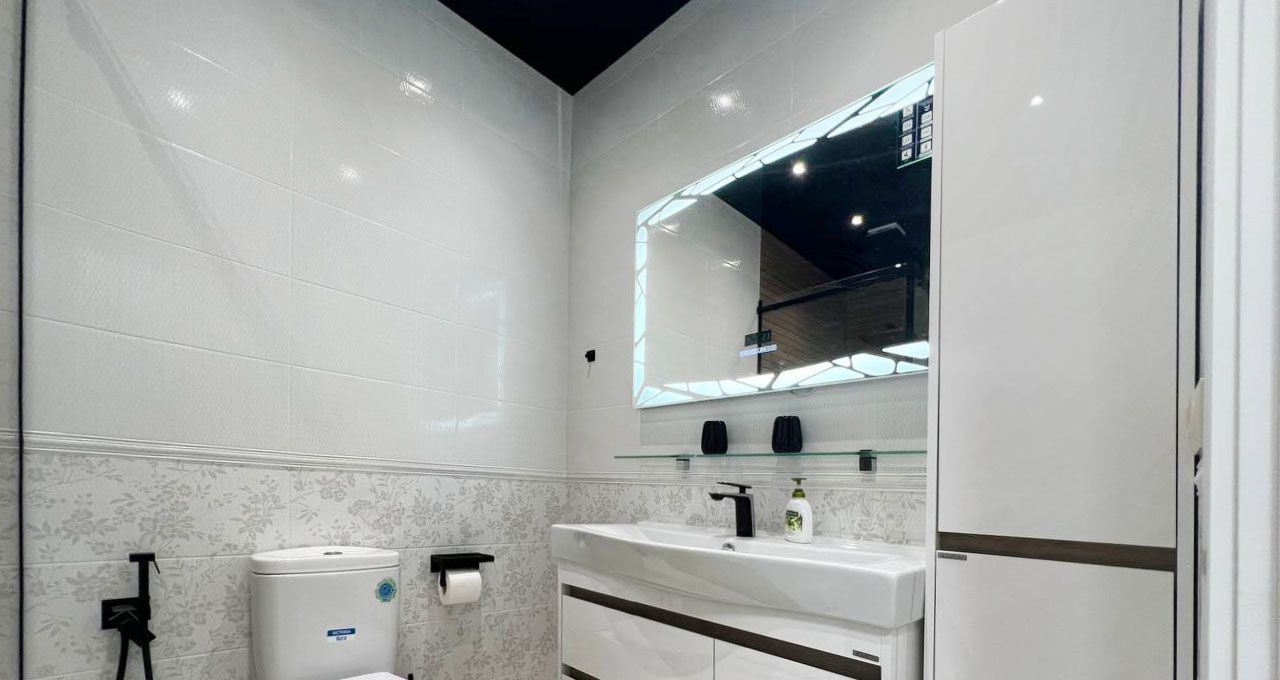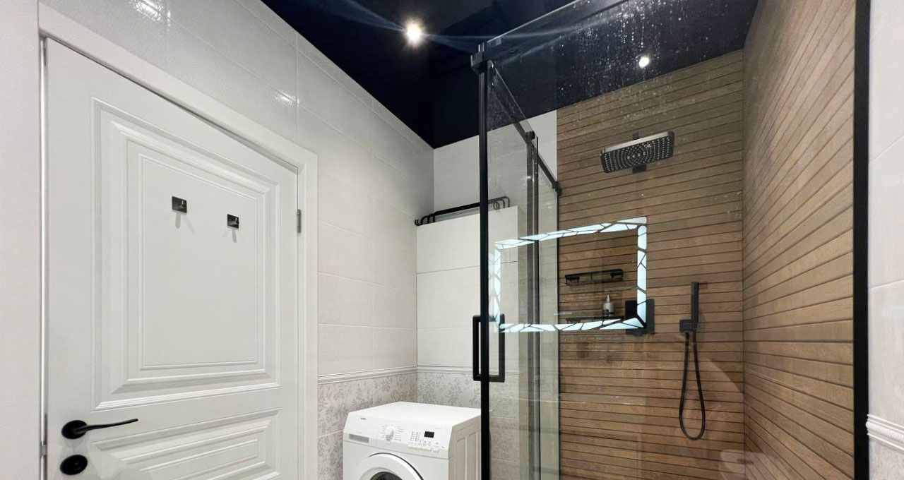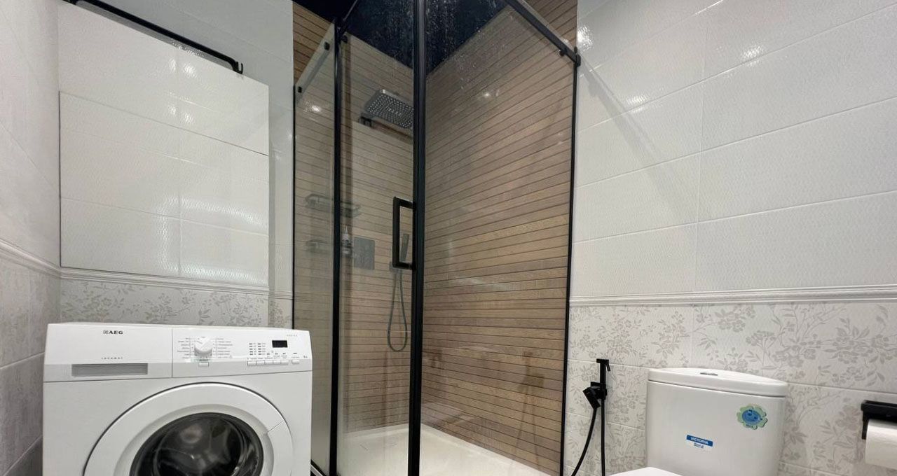 Вместительная ванная комната ~8 м² — современная душевая кабина с тропическим душем, качественная отделка, тёплый пол, стиральная машина.