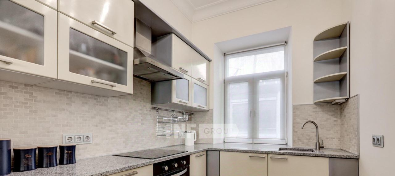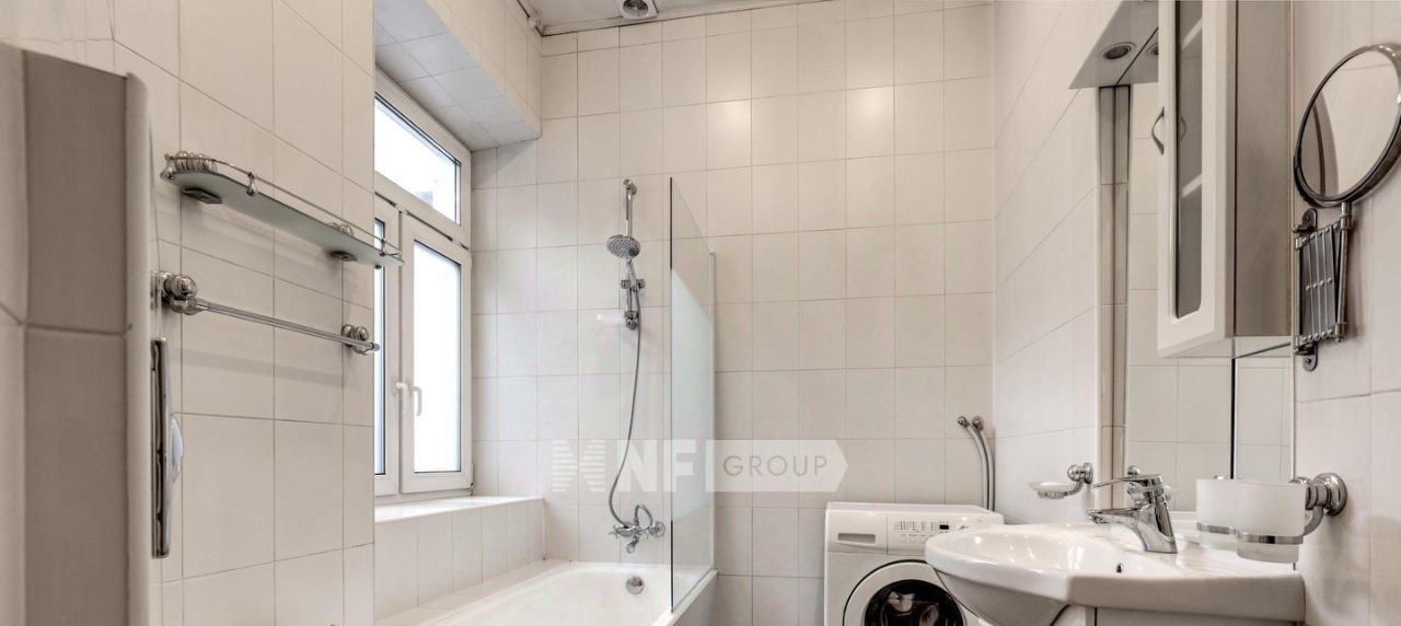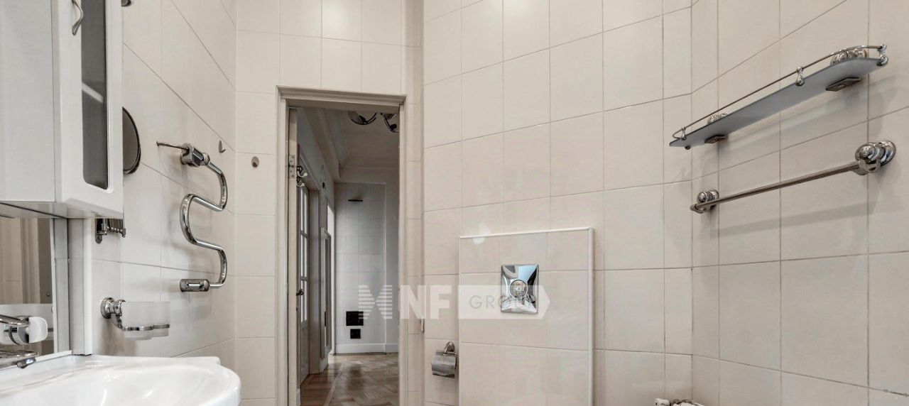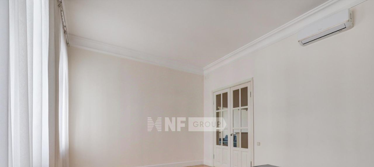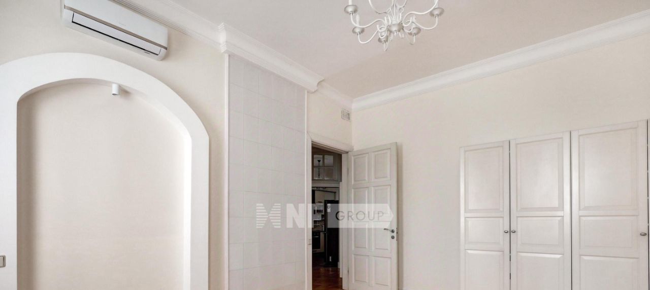 Интерьер выполнен в классическом стиле: паркет "ёлка", высокие потолки, декоративные ниши, камин и лепнина. Квартира полностью меблирована и оснащена техникой, предусмотрена система кондиционирования.