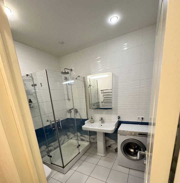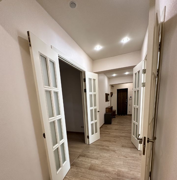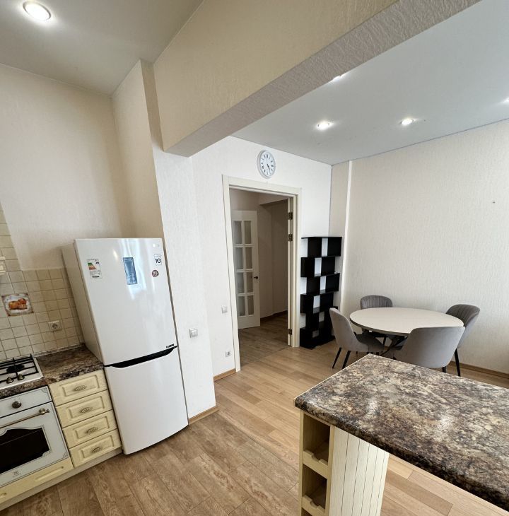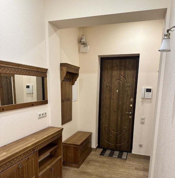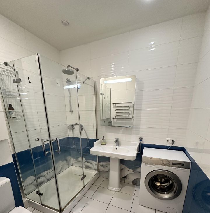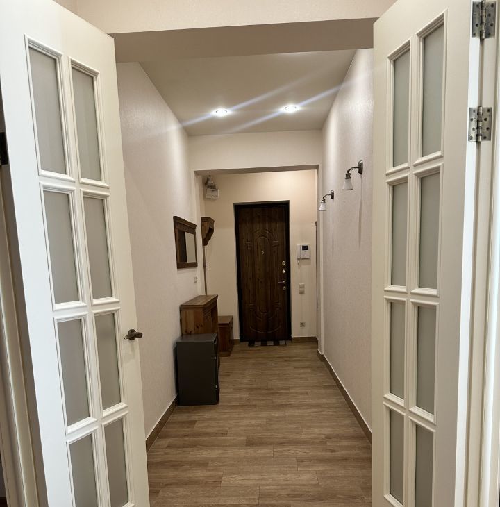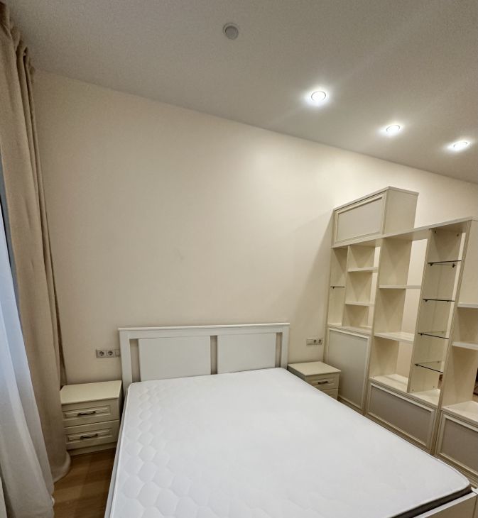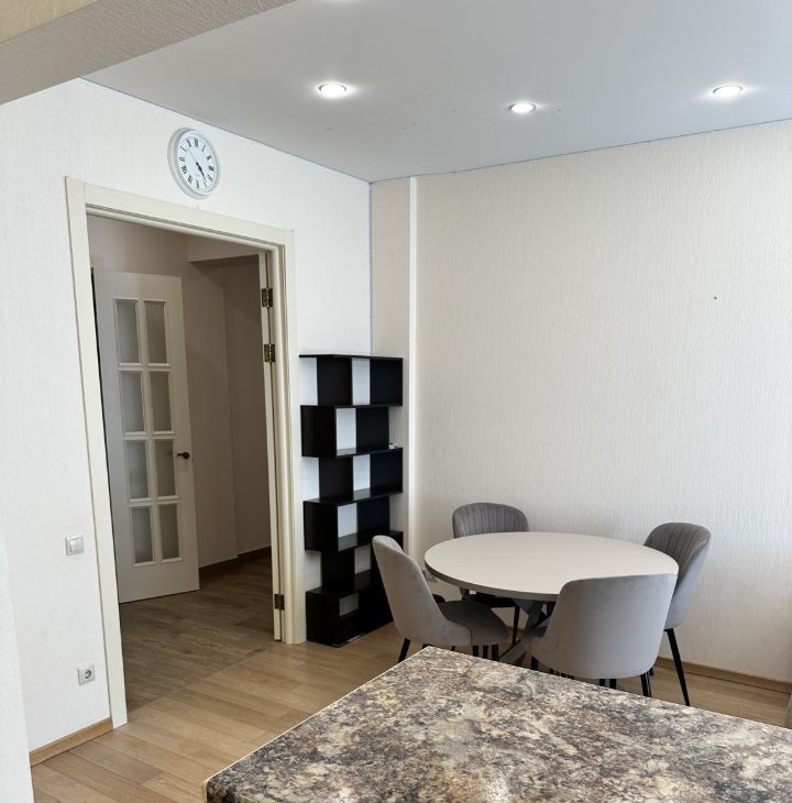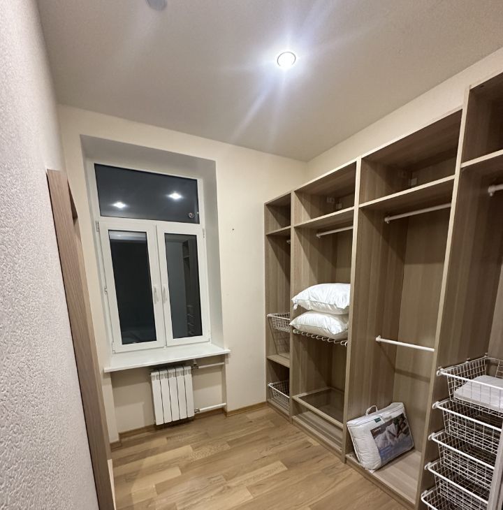 Планировка квартиры : широкий длинный холл с подсобным помещением за зеркальной дверью , слева -кухня -гостиная , укомплектована техникой ( посудомоечная , духовкой шкаф , свч, холодильник ), раскладной диван , телевизор , обеденная группа ( новая), кабинет или детская комната ; справа просторная спальня ( новый матрас, подушки , одеяла ) с зонированием пространства по своему усмотрению : рабочая зона , либо зона отдыха , и гардеробная комната с окном . Два санузла : гостевой и совмещенный санузел с душевой кабиной, стиральная машина. Установлен фильтр питьевой воды . Интернет .