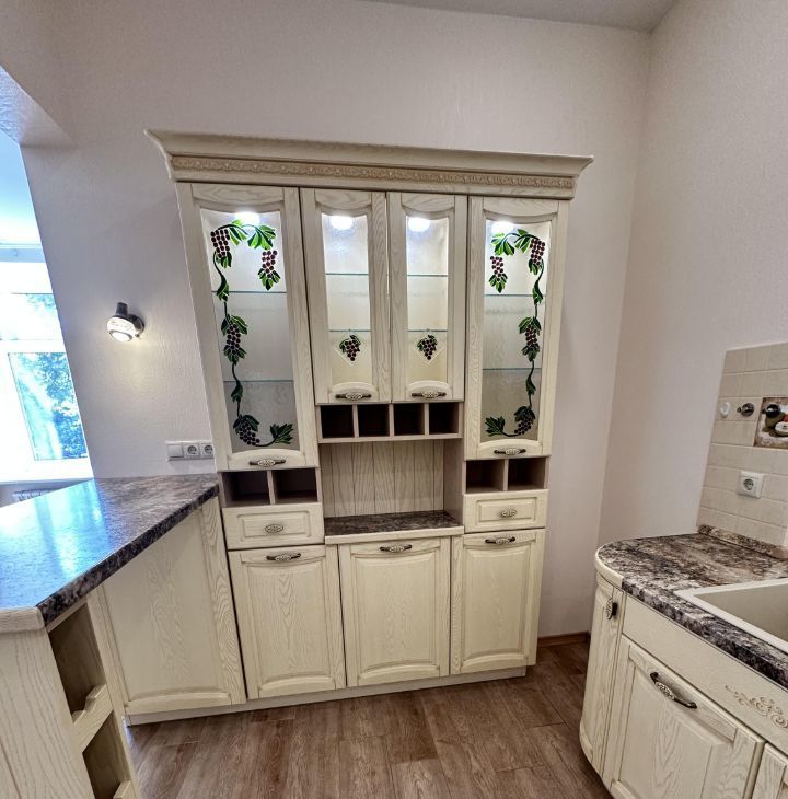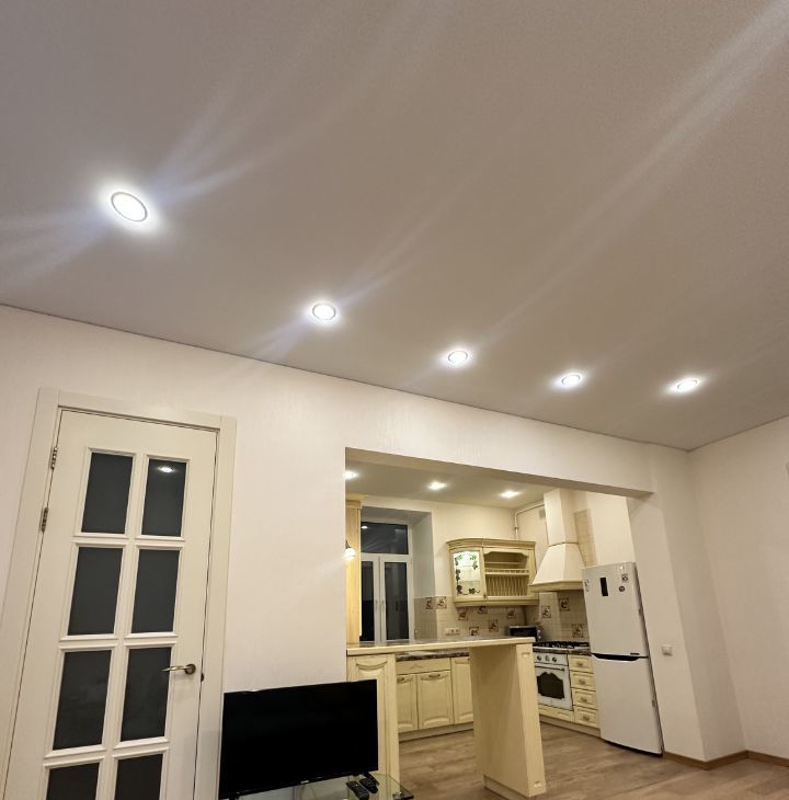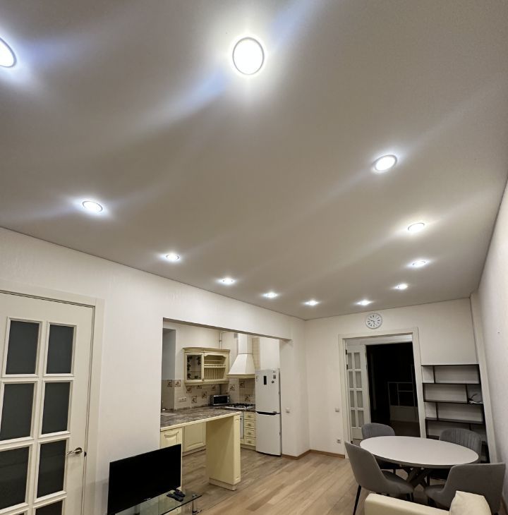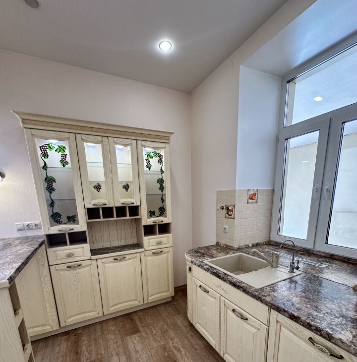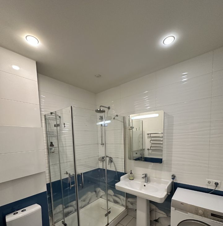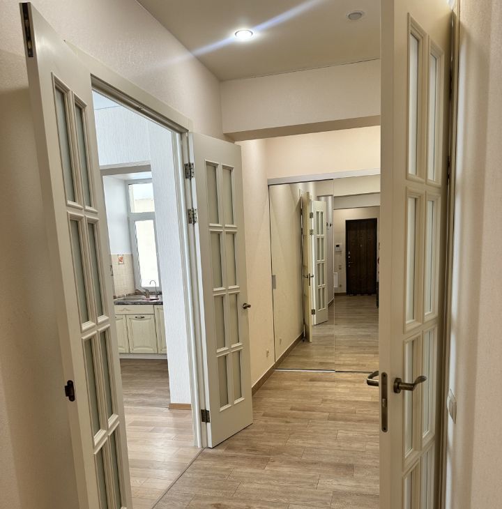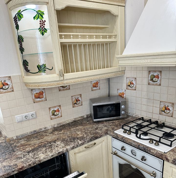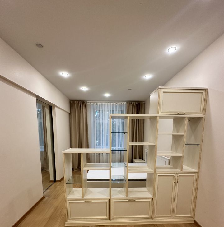 Планировка квартиры : широкий длинный холл с подсобным помещением за зеркальной дверью , слева -кухня -гостиная , укомплектована техникой ( посудомоечная , духовкой шкаф , свч, холодильник ), раскладной диван , телевизор , обеденная группа ( новая), кабинет или детская комната ; справа просторная спальня ( новый матрас, подушки , одеяла ) с зонированием пространства по своему усмотрению : рабочая зона , либо зона отдыха , и гардеробная комната с окном . Два санузла : гостевой и совмещенный санузел с душевой кабиной, стиральная машина. Установлен фильтр питьевой воды . Интернет .